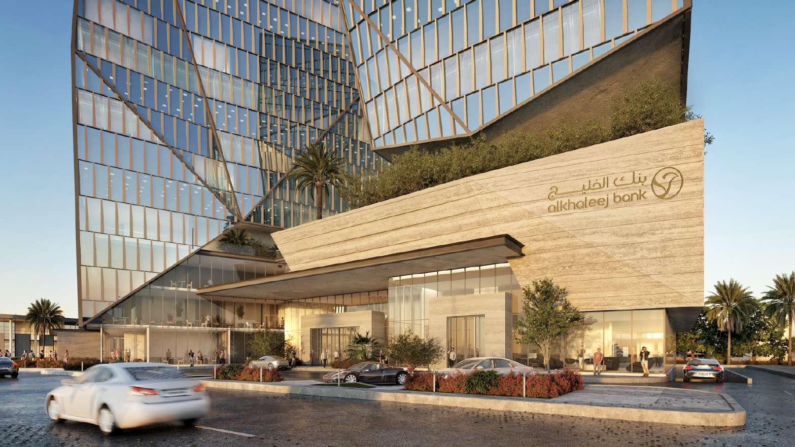 The building's contemporary architecture includes stacked masses articulated with a mix of large openings and narrow vertical windows against solid walls, softened by intermittent vertical louvered screens. The office building is complemented by formal landscaping, with a patterned mix of hardscaping along the main entry axis and softscaping and water features to the sides, creating a harmonious and functional workspace.