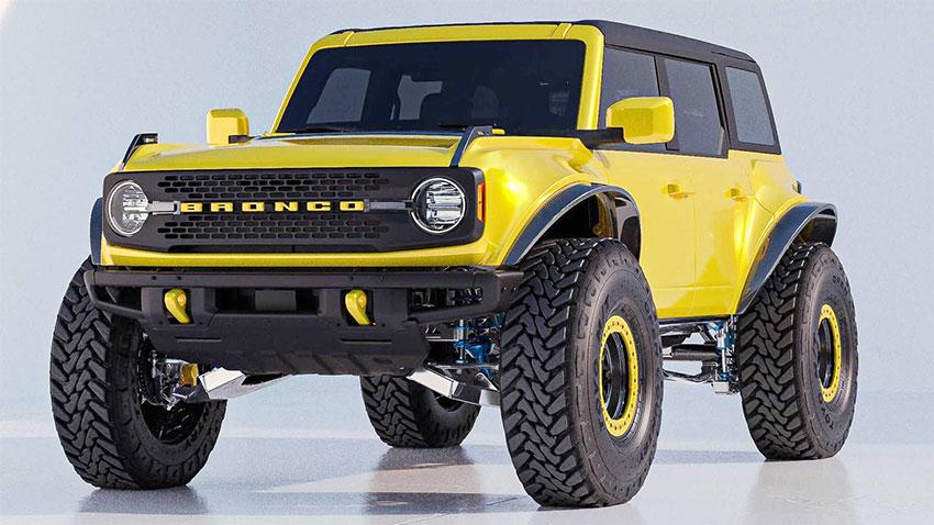 APG dice que han llevado el Bronco a un nivel completamente nuevo. El automóvil tiene un sistema de suspensión frontal de viaje Long Bronco agregado, lo que permite los brazos de control más bajos de 3.5 pulgadas por lateral y en caja a la red de 16.5 pulgadas de viaje de la rueda. King Coilovers y Bypass Shocks están en la parte posterior del Bronco, mientras que, para ajustar el estilo del Bronco, hay 100% de guardabarros delanteros y traseros de fibra de carbono aeroespacial. Estos también son 7 pulgadas más anchas por lado que los defensores estándar de Bronco.