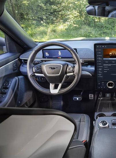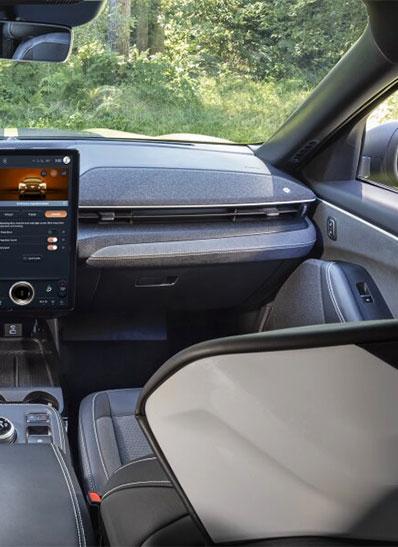 En cuanto a sus prestaciones como el interior, al encontrar la batería del Mustang Mach-E que está colocada entre el piso interior y la parte inferior del vehículo, crea un espacio excelente para los pasajeros y la carga. El tablero de instrumentos aerodinámico alberga un atractivo grupo de indicadores digitales y está dominado por una enorme pantalla táctil orientada verticalmente. Un bolsillo debajo del apoyabrazos flotante entre los pasajeros del asiento delantero que es lo suficientemente grande como para albergar una cartera de mujer.