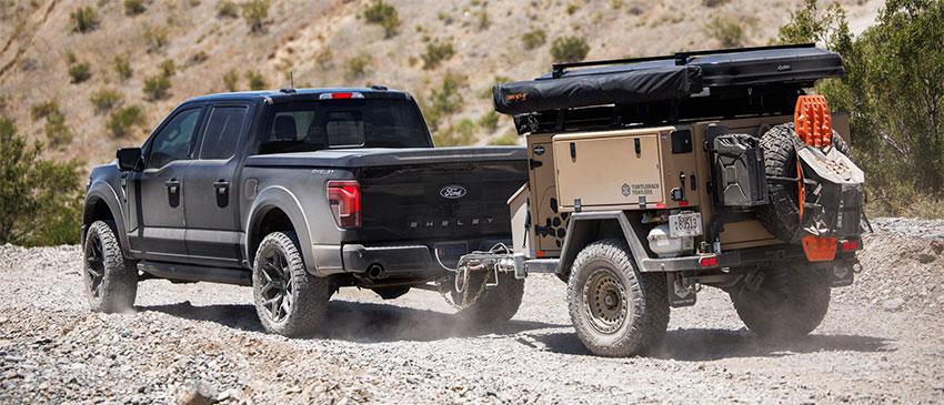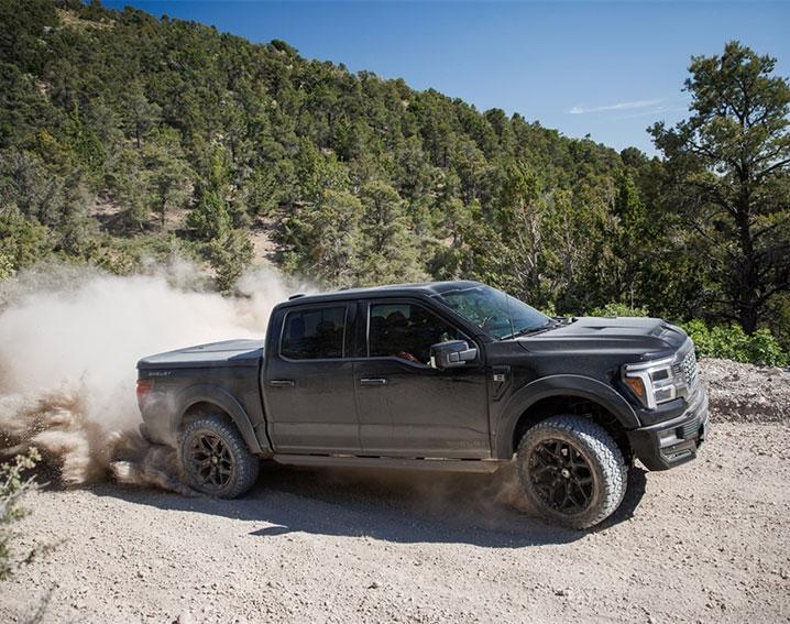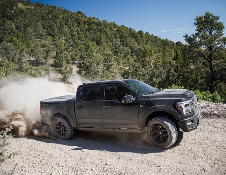Se desplaza sobre un sistema de amortiguación de carreras FOX 2.5 con tecnología de amortiguación de derivación interna, controles de velocidad dual ajustables, barras de tracción traseras de alto rendimiento y sistema de elevación Shelby BDS de 3 pulgadas. Está calzado con llantas de aleación Shelby de 22 pulgadas envueltas en neumáticos todoterreno premium de 35 pulgadas. El escape gutural proviene del CAT-back Shelby by Borla.