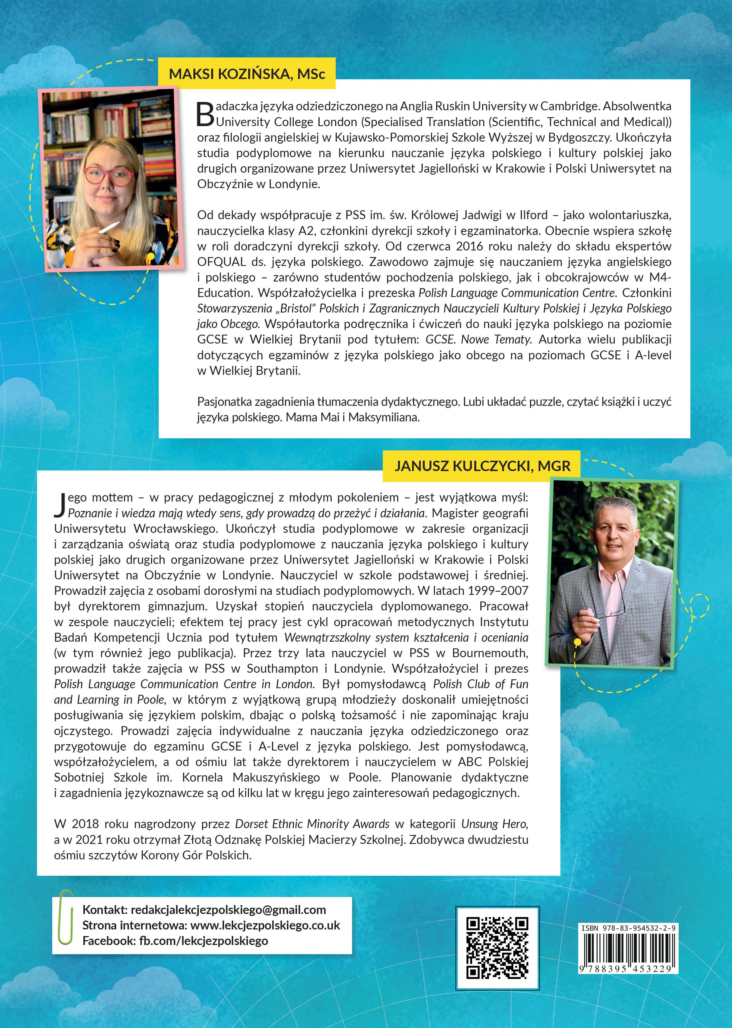 Książka, którą trzymacie Państwo w dłoniach, jest owocem ponad rocznej pracy (w czasach globalnej pandemii) dwojga nauczycieli, którzy żonglowali czasem między obowiązkami zawodowymi a domowymi. Mamy nadzieję, że nasze zaangażowanie i determinacja w tworzeniu tej publikacji przyniosą wymierny wpływ na edukację dzieci polonijnych w Wielkiej Brytanii. Dziękujemy naszym cudownym koleżankom ze Stowarzyszenia Polish Language Communication Centre in London – Monice Ozgovercin i Basi Szczotce. Dziękujemy również odbiorczyniom pierwszej części podręcznika, które podzieliły się z nami swoimi uwagami, sugestiami oraz bogatą informacją zwrotną, która pozwala nam nieustannie ulepszać nasze materiały edukacyjne. Serdeczne dzięki!