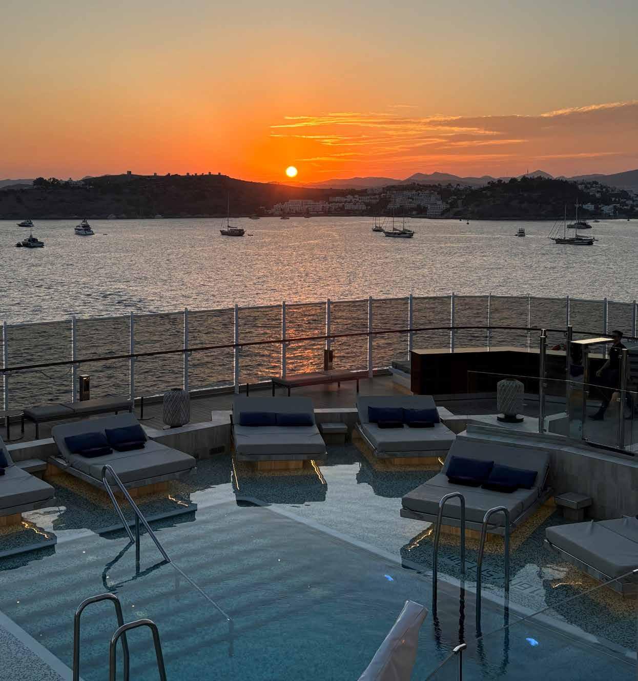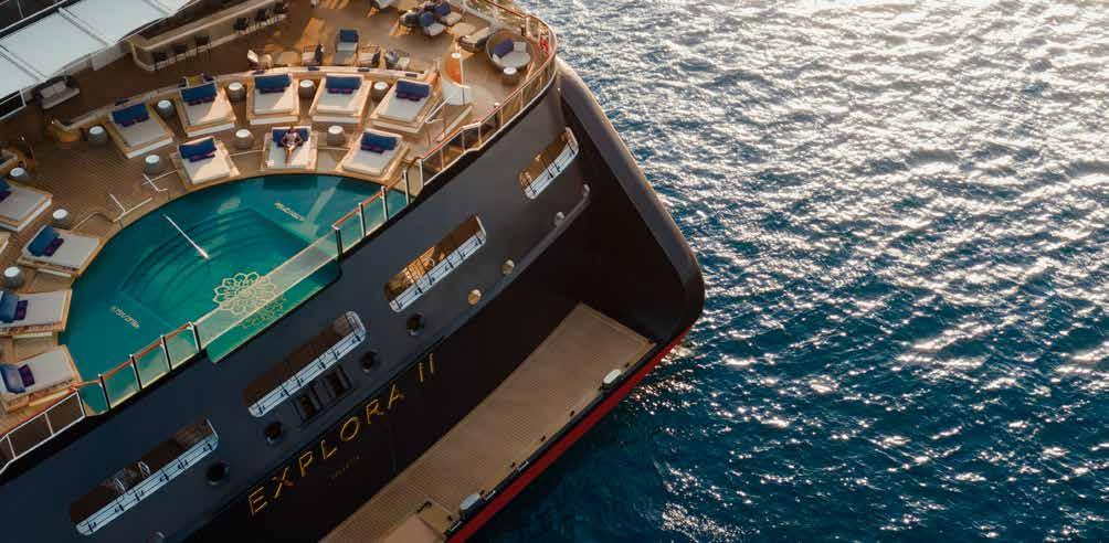 winkelen. Na het diner was het tijd om naar het achterdek te gaan voor een koel drankje en een onvergetelijke zonsondergang, die op typische Explora wijze werd begeleid door relaxte lounge muziek van de scheeps-DJ. n