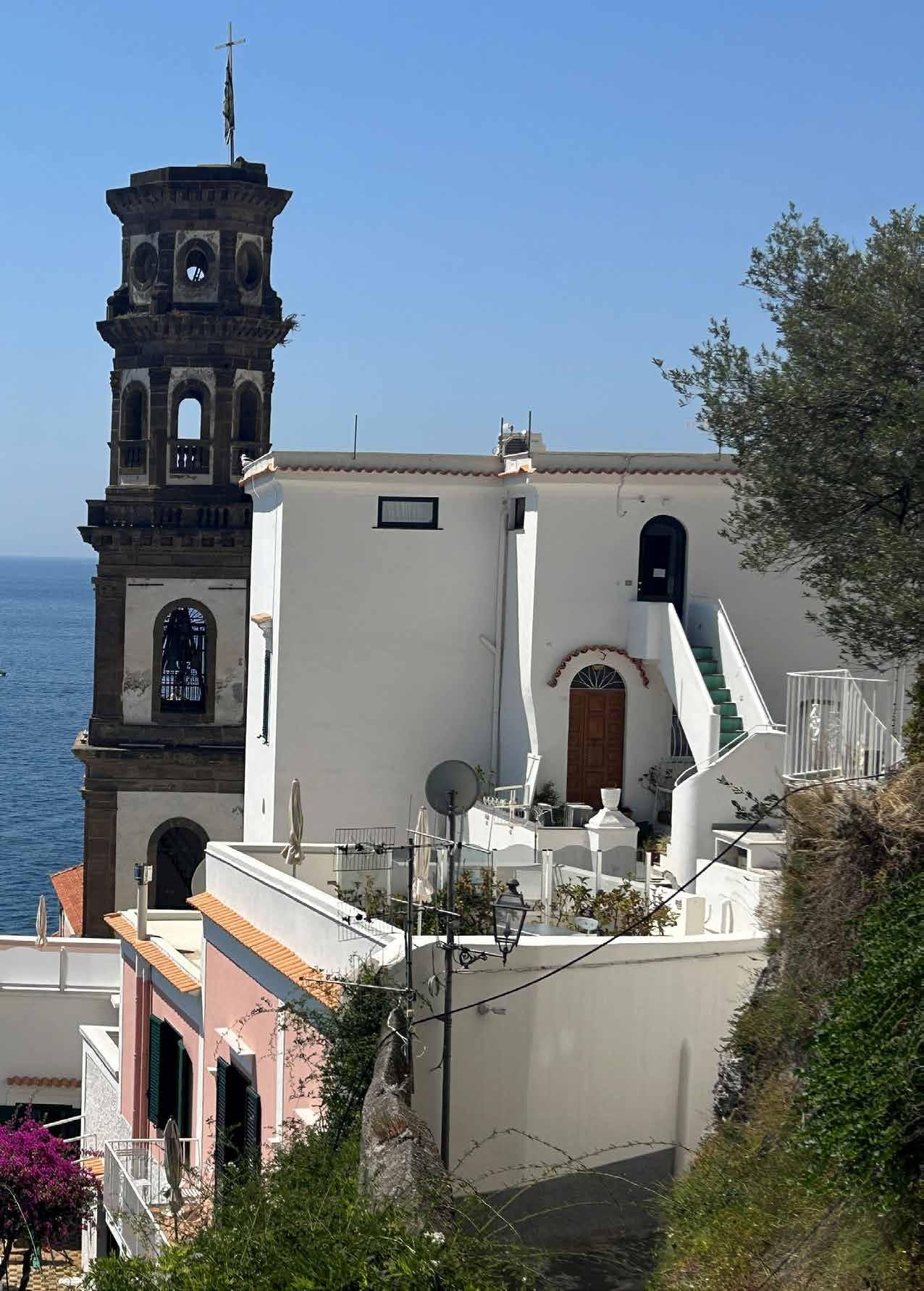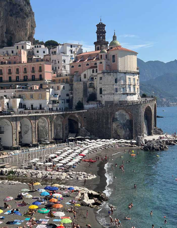van dit stadje ontdek je door verlaten steegjes te dwalen, trappen te beklimmen en dan beloond te worden met onvergetelijke uitzichten. Hier word je begroet met een vriendelijk ‘Buon Giorno!’ Via een voetgangerstunnel wandel ik naar het volgende dorp: Atrani. Als ik de tunnel uit kom zie ik een strand met felgekleurde parasols, bewaakt door een machtige kerk en een al even machtig viaduct met pastelkleurige huizen. De tijd heeft hier stil gestaan en ik kan de toeristen op de vingers van één hand tellen. Een sprookje.