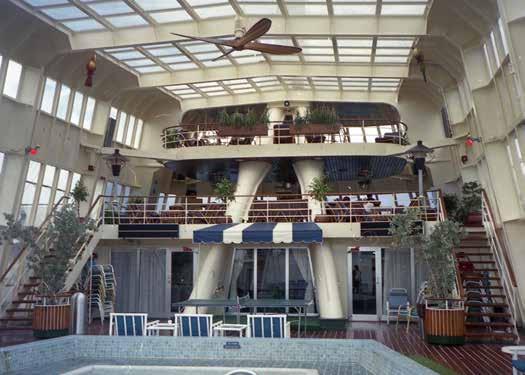 In Cozumel, Mexico legden we aan naast de Starward van Norwegian Caribbean Lines (nu Norwegian Cruise Line). In die tijd kon je met je VCK visitekaartje in de hand gewoon vragen of je even aan boord mocht rondkijken. En zo stapten we monter de Starward op. Naar huidige begrippen was de in 1968 gebouwde Starward klein. Het 160 meter lange schip bood plaats aan maar liefst 736 passagiers in zeer simpele (en gehorige!) hutten. Toch was het juist dit schip dat de basis heeft gelegd voor het latere succes van Norwegian Cruise Line. Ze was gebouwd als cruiseschip met autodek voor de dienst tussen Miami en de Bahamas. Maar al snel werd NCL de pionier in het organiseren van fly-cruises naar de Caribbean. Hoewel de meeste publieke ruimtes tijdens ons bezoek niet veel indruk maakten, waren we meteen verkocht toen we de Tropicana Bar zagen. Deze exotische openlucht bar strekte zich uit over drie dekken en keek uit over het zwembad. uit