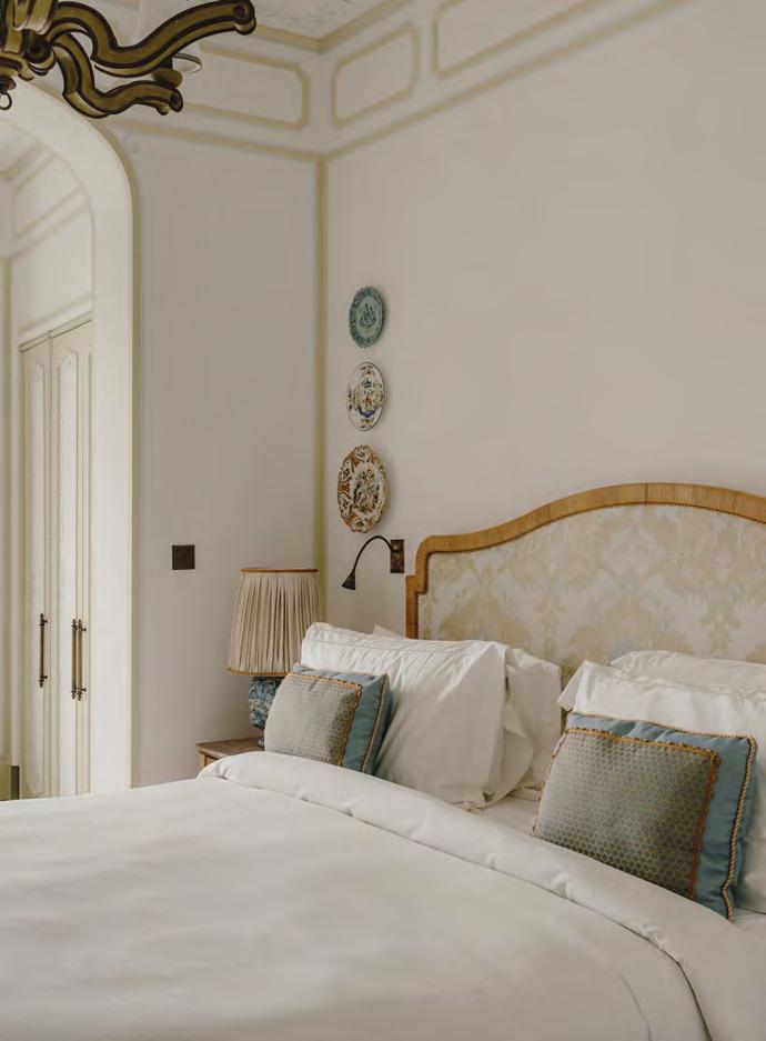 El resultado es una atmósfera que se percibe más que se describe. Las habitaciones y suites son refugios de armonía donde el confort adquiere una dimensión casi escultórica. Maderas nobles, sedas suaves y mármoles cálidos conviven con líneas depuradas y obras de arte seleccionadas con la precisión de una galería contemporánea. Algunas suites se abren hacia las copas del Retiro o las cúpulas del Prado; otras se resguardan en el silencio dorado de los patios interiores. Todas comparten un mismo lenguaje: el de la elegancia sin exceso, donde la belleza no pretende imponerse, sino acompañar.
