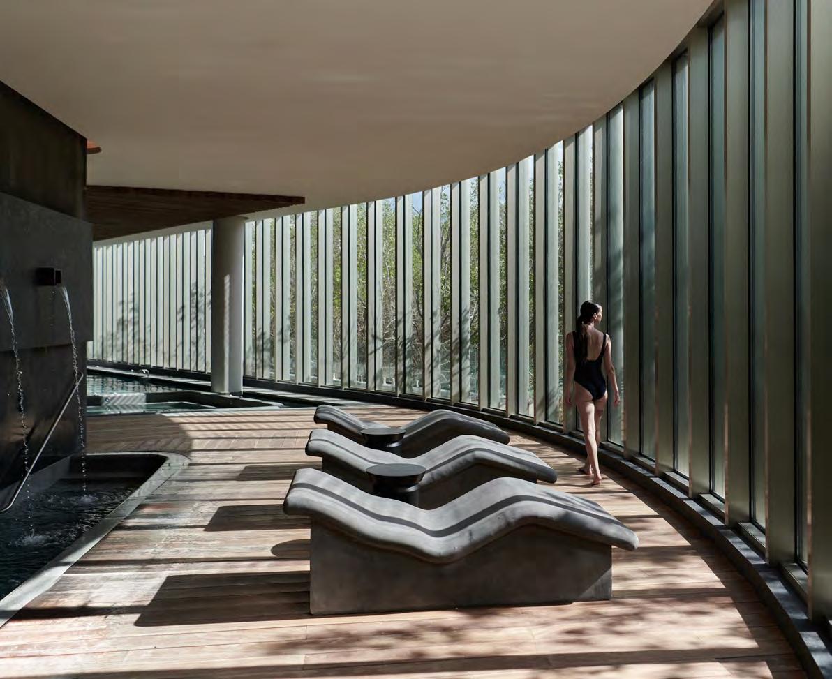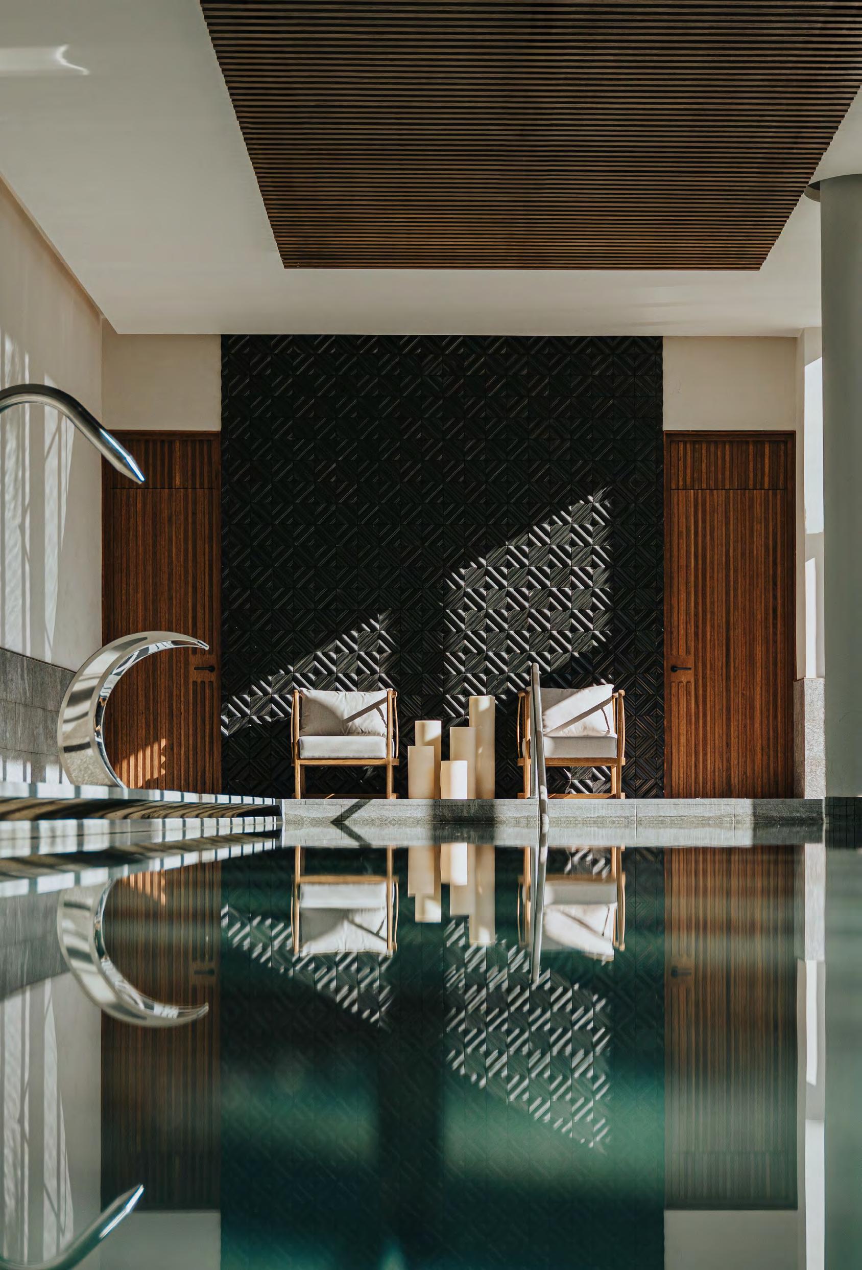 En la planta baja, un ritual más tranquilo espera. En colaboración con Susanne Kaufmann, el spa se despliega como un santuario de madera, agua y silencio. Entre sauna y piscina, el tiempo suaviza su paso; la naturaleza y la ciencia comparten un lenguaje común de cuidado.