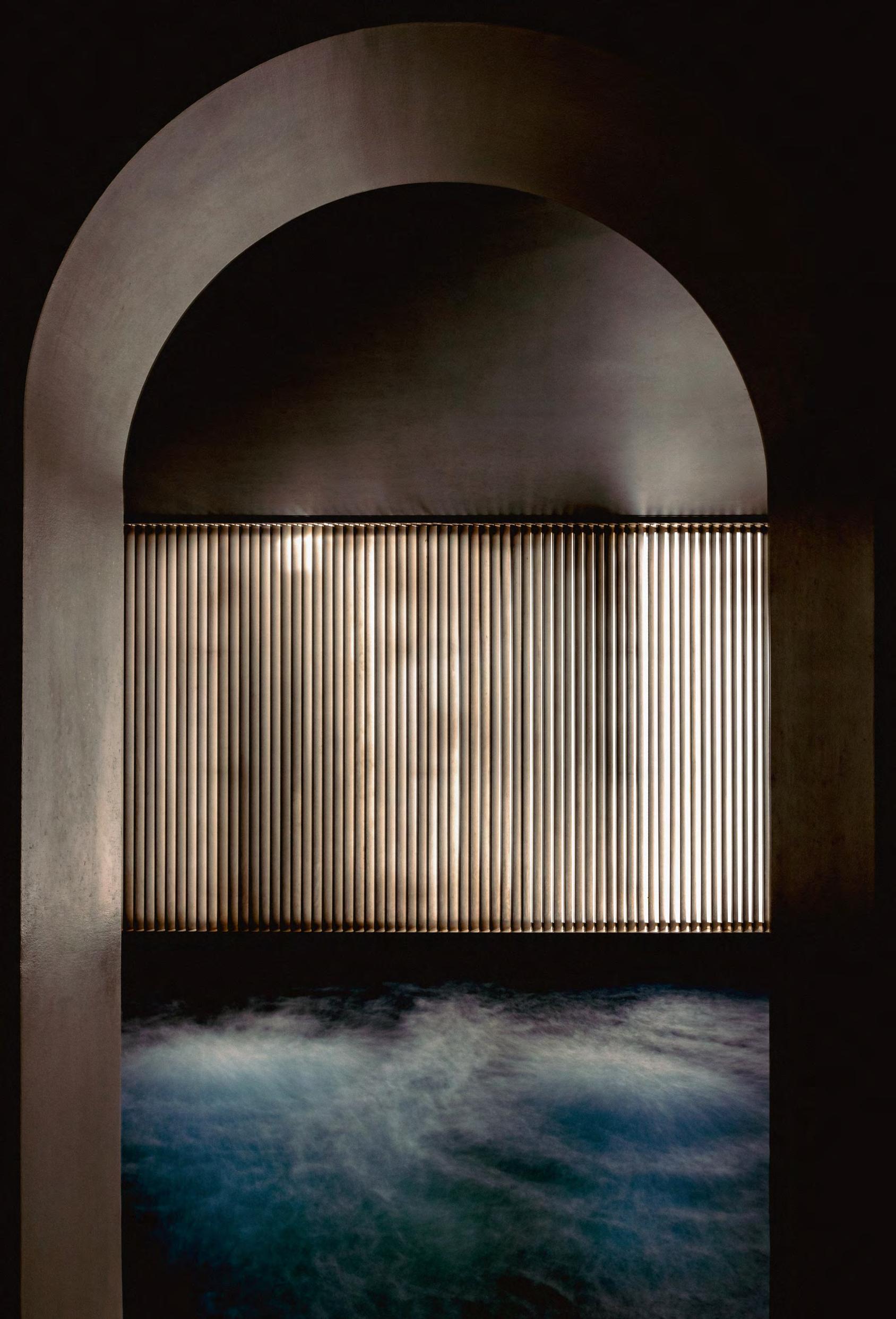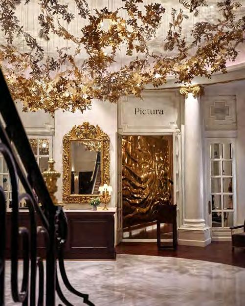 En su interior, la arquitectura se siente como una catedral del hedonismo moderno. Grandes bóvedas se elevan hacia un techo de cristal donde la luz del día se derrama como miel, dibujando la geometría de las mañanas parisinas. Desde la madera tallada hasta el terciopelo ámbar, sus componentes hablan de contrastes, lo sagrado y lo sensual, lo monumental y lo íntimo. La mano de Auer evoca el diario de un viajero convertido en muros y luz, guiado por una musa ficticia: una trotamundos que colecciona fragmentos del mundo, bocetos de lugares vistos e imaginados.