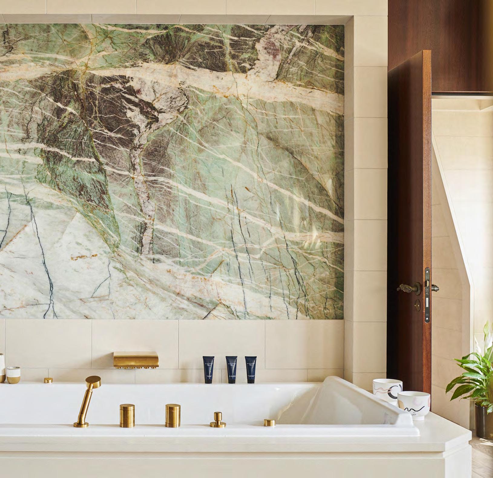 El arquitecto Ed Tuttle, responsable de la arquitectura y el interiorismo del hotel, trazó su espacio con la precisión de quien entiende la materia como lenguaje. La madera de caoba, la piedra caliza parisina, el bronce y el ónix verde forman una paleta contenida. Nada sobra, nada se exhibe. La luz se mueve con lentitud sobre las superficies, revelando la intención de un diseño que privilegia la proporción y la calma.
