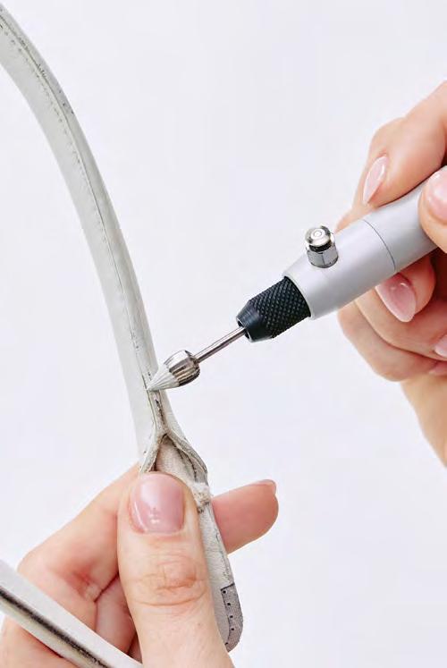 Luego viene el corte: ya no es solo dividir pieles, sino decidir cómo cada pieza se doblará, alojará tensión y resistirá el uso. Se emplean plantillas de corte de alta precisión o troqueles artesanales, además de técnicas de calibrado para evitar roturas en las zonas de pliegue y un lijado de bordes que aporta suavidad. Cada borde acabado se pinta y barniza a mano para sellar los poros y armonizar el color. Después, con adhesivos aplicados con precisión, se fija cada componente en su lugar antes del cosido. Algunas costuras avanzan en máquinas de brazo largo, pero los puntos más delicados se dejan al pulso humano: costuras curvas,