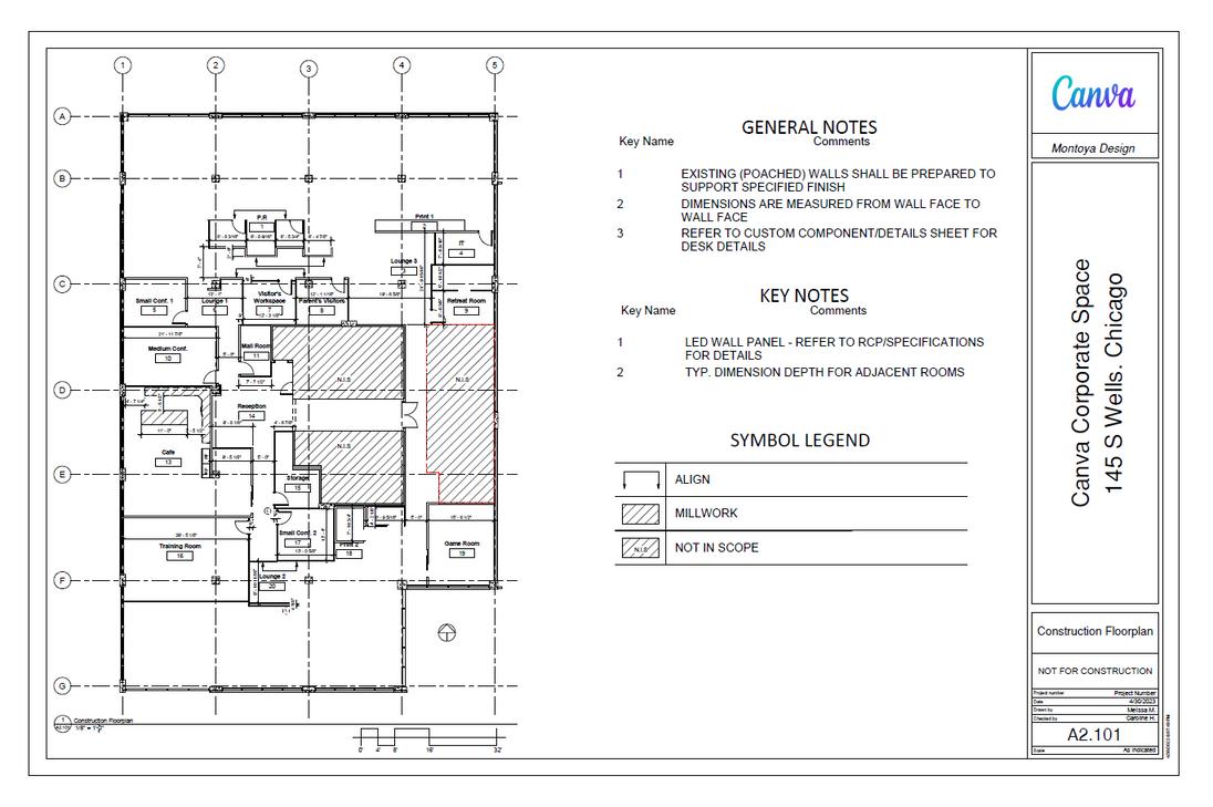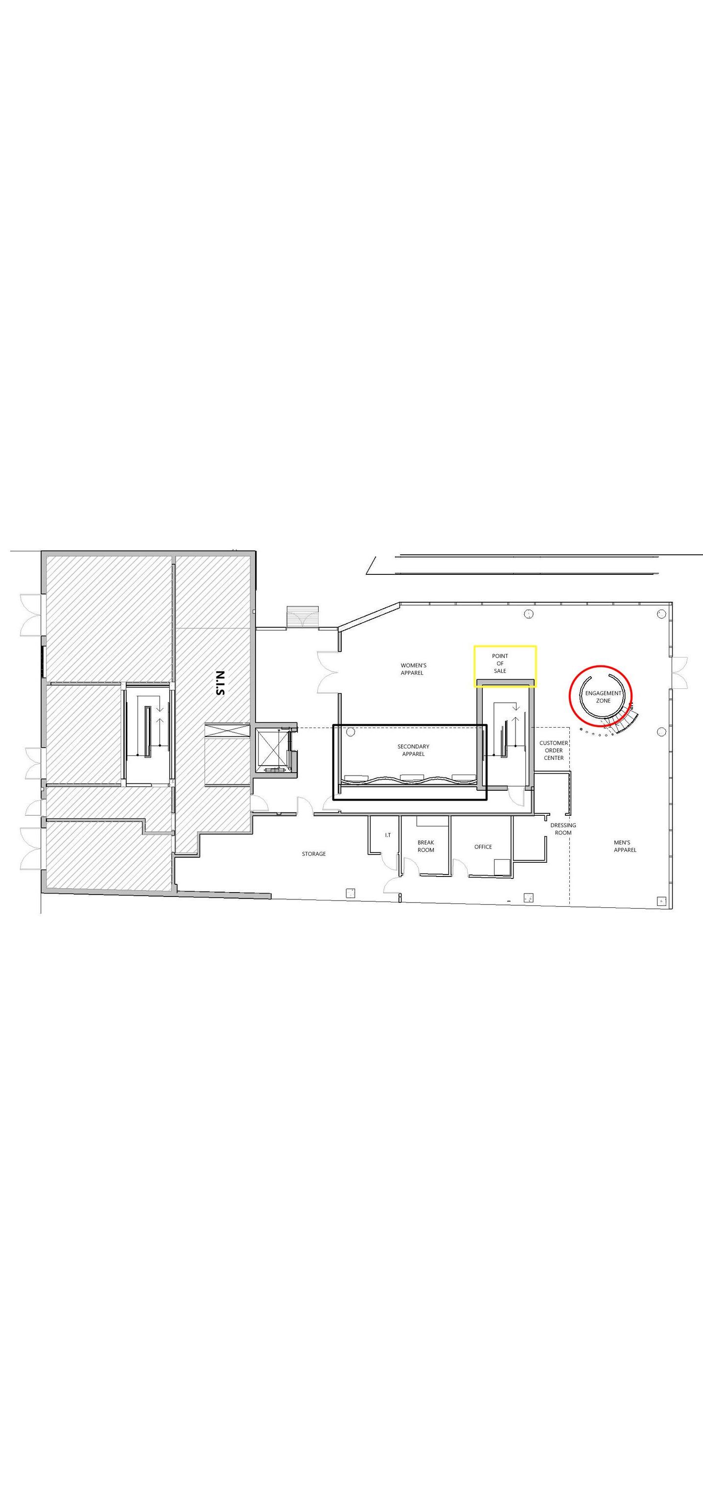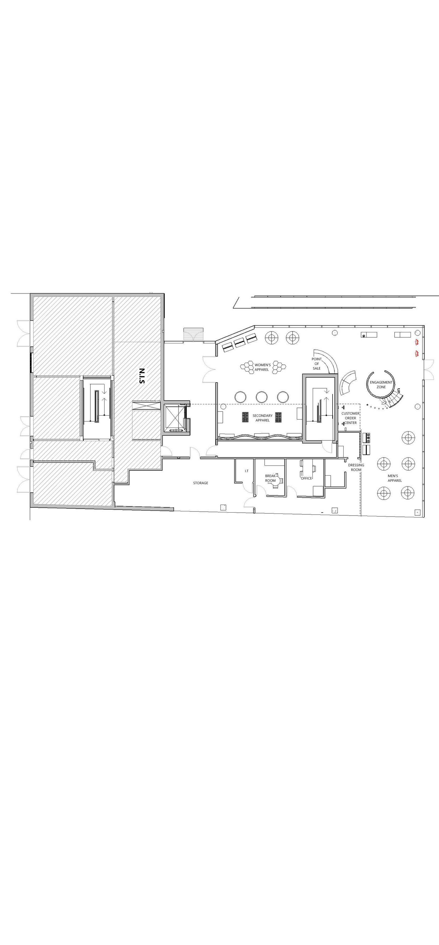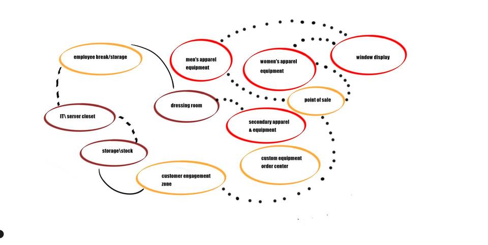 The design idea "ignite your potential" is derived from Wilson's mission statement. It relates to the program because Wilson's products are meant to bring out the best in their athletes, creating a "spark" that resembles the chemical reaction of a flame. The spark is then followed by smoke, which is the buyer's evaluatio stage and will be translated into space by the use of dark colored materials and free-flow layout. Th afterglow comes once athletes/customers buy their product and will be brought to life with an illuminated custom order center and P.O.S.