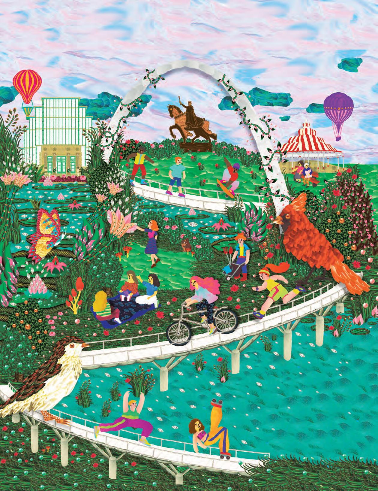 For this issue, Buenos Airesbased illustrator Iris de Luz created a digital collage based on landmarks, parks and greenspace in and around St. Louis. Of the images she uses, de Luz said, “I think of them as if they were part of a digital ecosystem where each element, when joined with others, builds a new character.” 64
