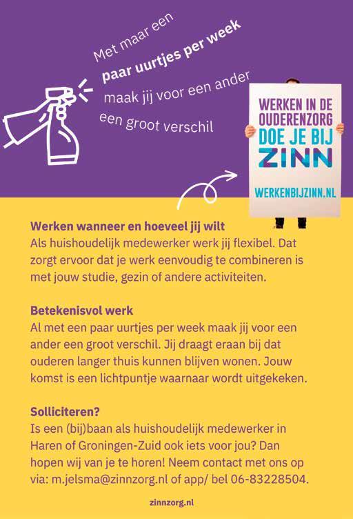 Dit laatste kan worden afgeleid uit een veel gehoorde reactie van clienten: “Het is niet alleen de hulp in huis, het is vooral ook dat sociale contact. Ik kijk ernaar uit en leef ervan op’ .Meer informatie op werkenbijzinn.nl of neem contact op via m.jelsma@zinnzorg.nl (0505852154). App: 06-83228504.