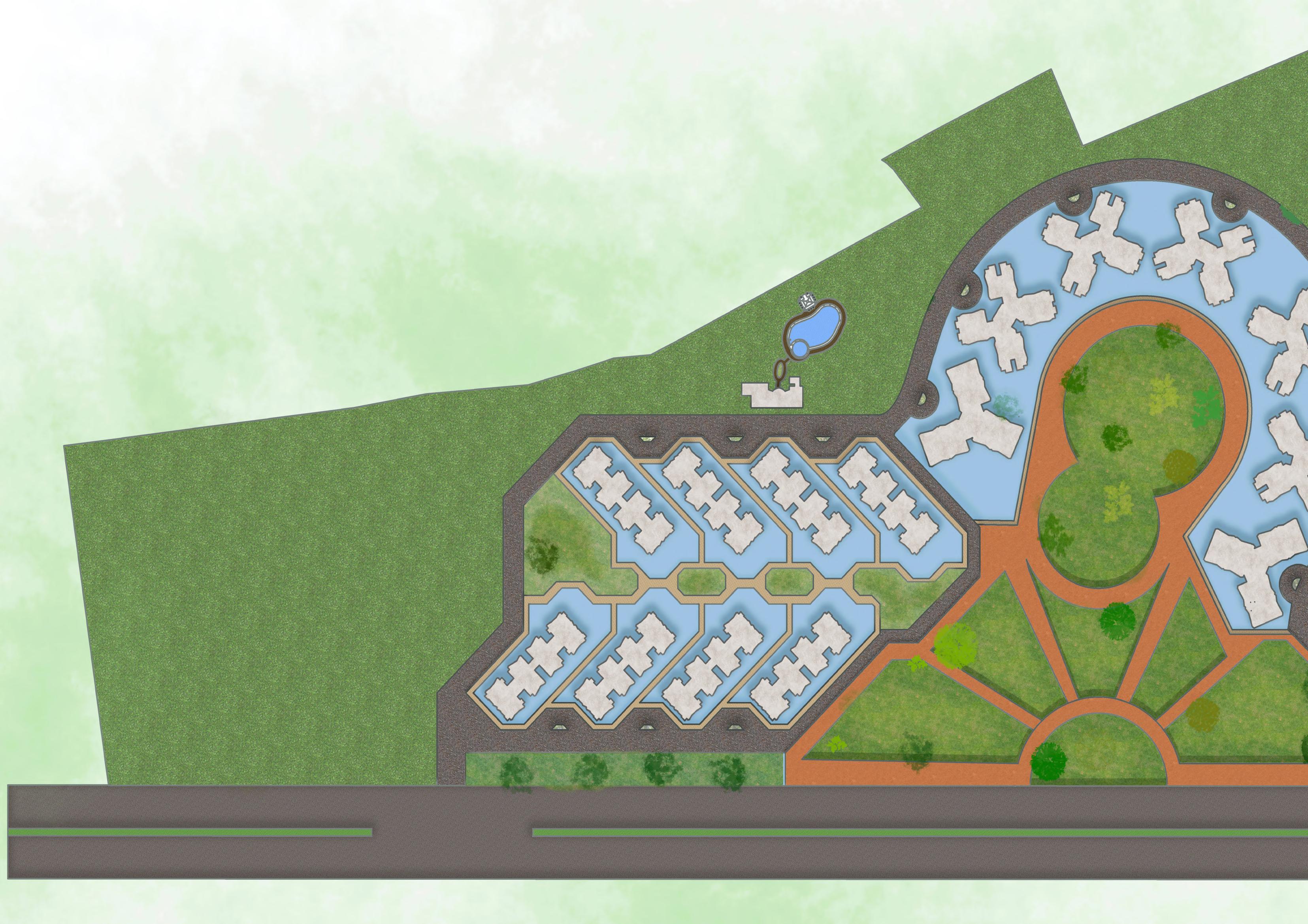 • THIS SITE PLAN OUTLINES THE DEVELOPMENT OF A GROUP HOUSING SITE SPANNING 100 ACRES IN INDORE, CONSIDERING THE CITY’S CLIMATE AND VARIOUS ESSENTIAL DESIGN CONSIDERATIONS. INDORE EXPERIENCES A SUBTROPICAL CLIMATE WITH HOT SUMMERS AND MILD WINTERS, WHICH HAVE BEEN TAKEN INTO ACCOUNT THROUGHOUT THE PLANNING PROCESS.