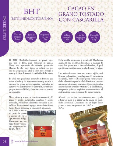 El BHT (Butilhidroxitolueno) se puede mezclar con el BHA para potenciar su acción. Tiene una apariencia de cristales granulados blancos de olor muy ligero, es soluble en grasas; no proporciona sabor u olor pero protege el sabor y el color al prevenir la oxidación de las masas. Es ideal para productos horneados y fritos ya que resiste el calor y las altas temperaturas y retarda la rancidez de grasas, aceites vegetales y animales, así como de los alimentos que lo contienen, además que proporciona estabilidad y duración contra el proceso de oxidación. No es tóxico y se usa en vitaminas oleosas A y E, grasas y aceites industriales, parafinas y aceites esenciales, polietileno, alimentos envasados y cosméticos. Se recomienda agregar a materiales frescos (antes de que comience la oxidación), agregando de 0.01% a 0.02% en peso de grasas y aceites (de 1gr a 2gr por cada 10kg). Consérvese en un lugar fresco y seco a una temperatura de 18ºC a 25ºC.