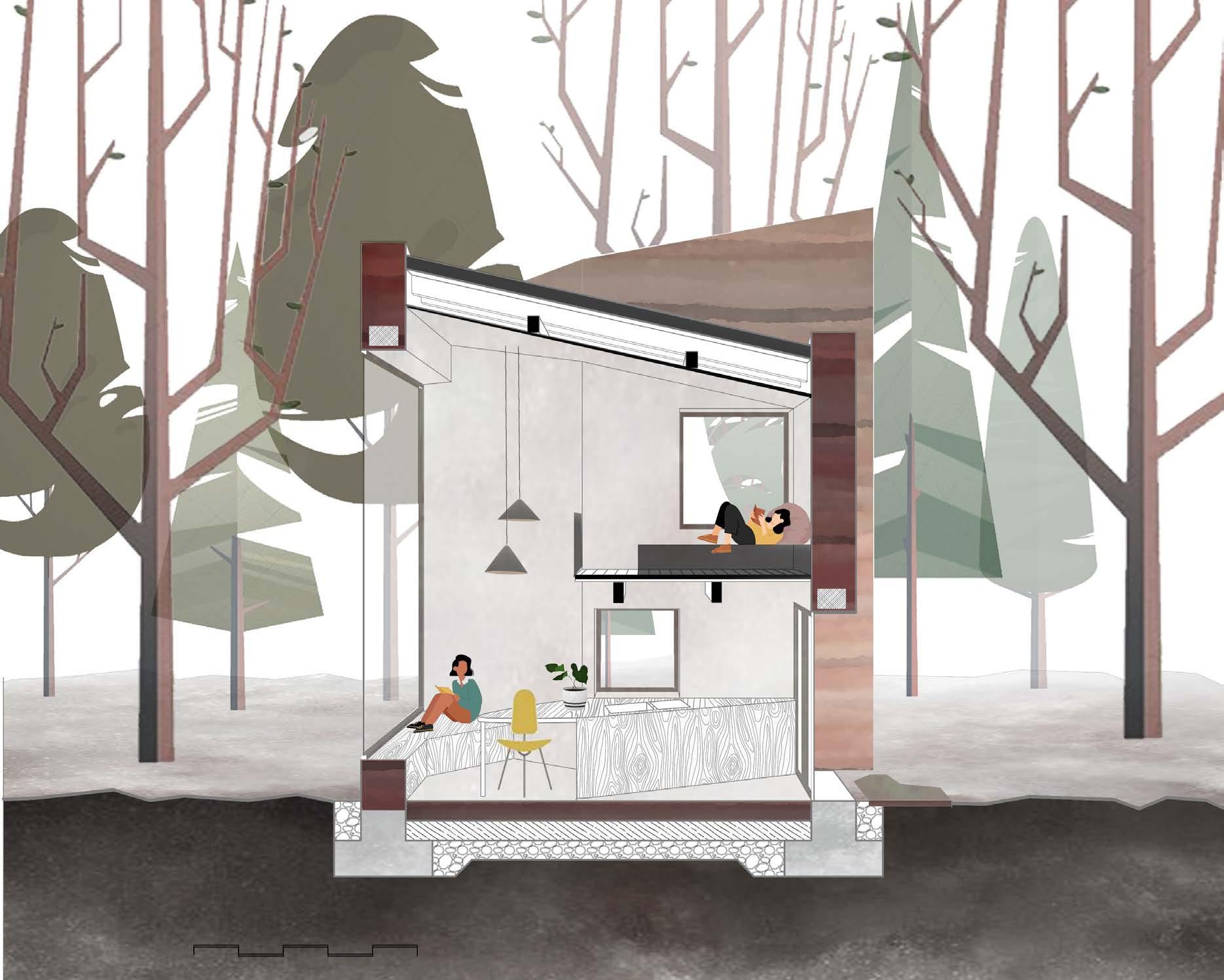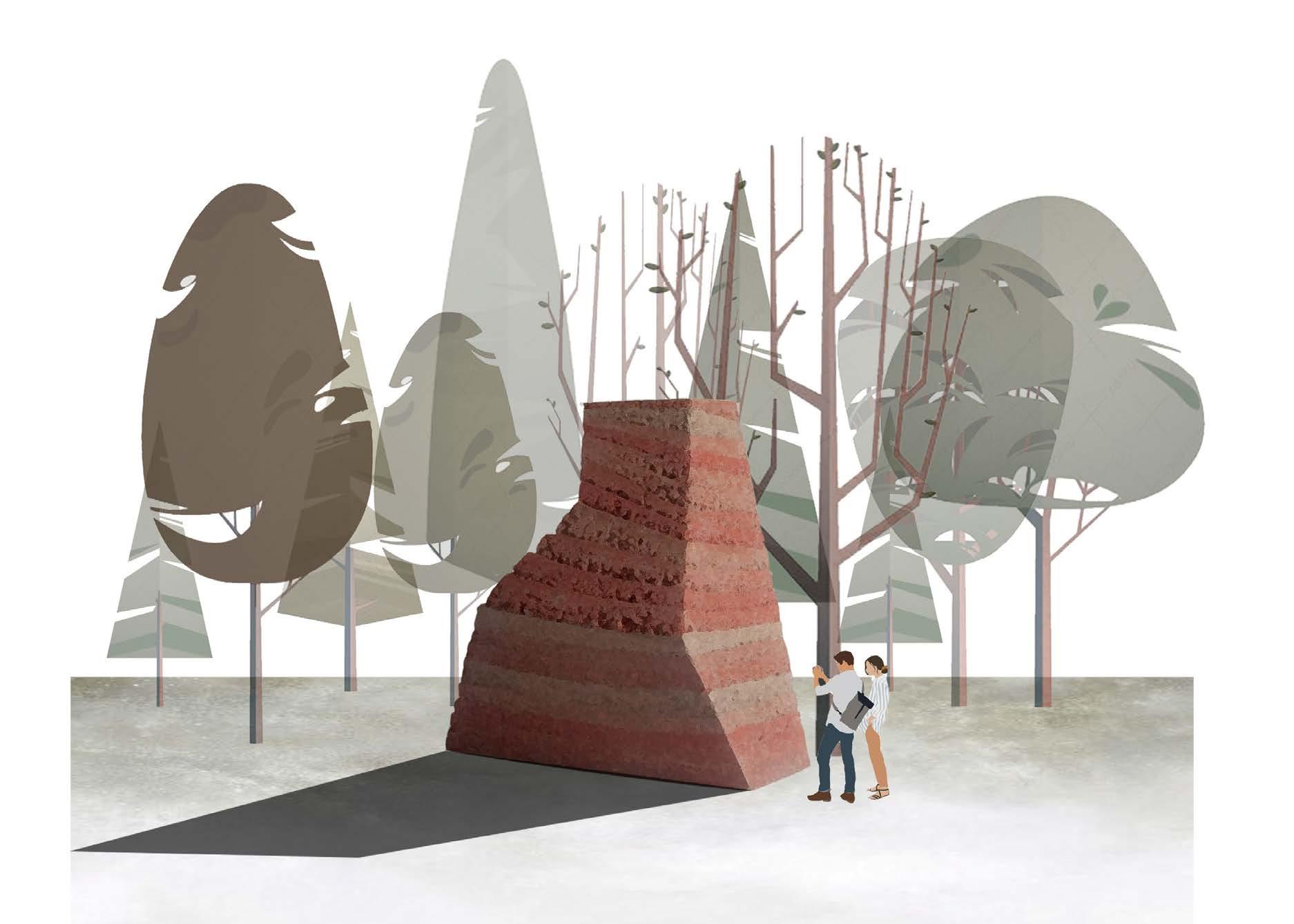 L’esthétique de la terre crue a été le point de départ de notre projet. Son aspect sculptural est devenu la ligne directrice de notre concept architectural. La terre crue elle-même a des qualités plastiques en raison des di érentes couches colorées obtenues par la technique de construction. C’est la raison pour laquelle notre concept devient la mise en scène de la matière. L’idée est d’obtenir un objet sculptural habité implanté dans les bois.