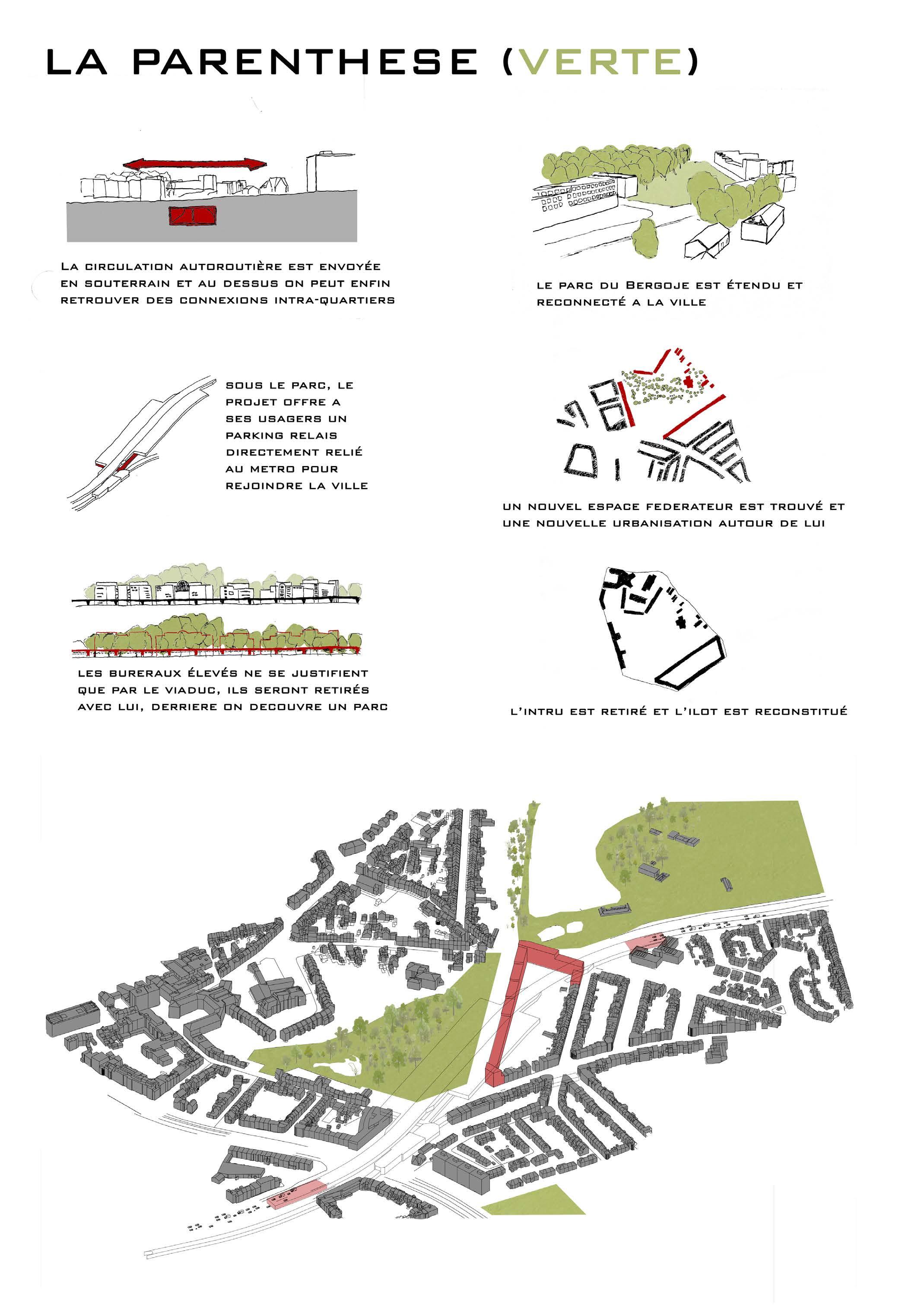 Au vue de ces constats, ma proposition était donc d’envoyer la circulation en souterrain pour permettre au quartier de se reconstituer au-dessus, ce tunnel serait flanqué d’un grand parking de relais directement relié à la station de métro à proximité.