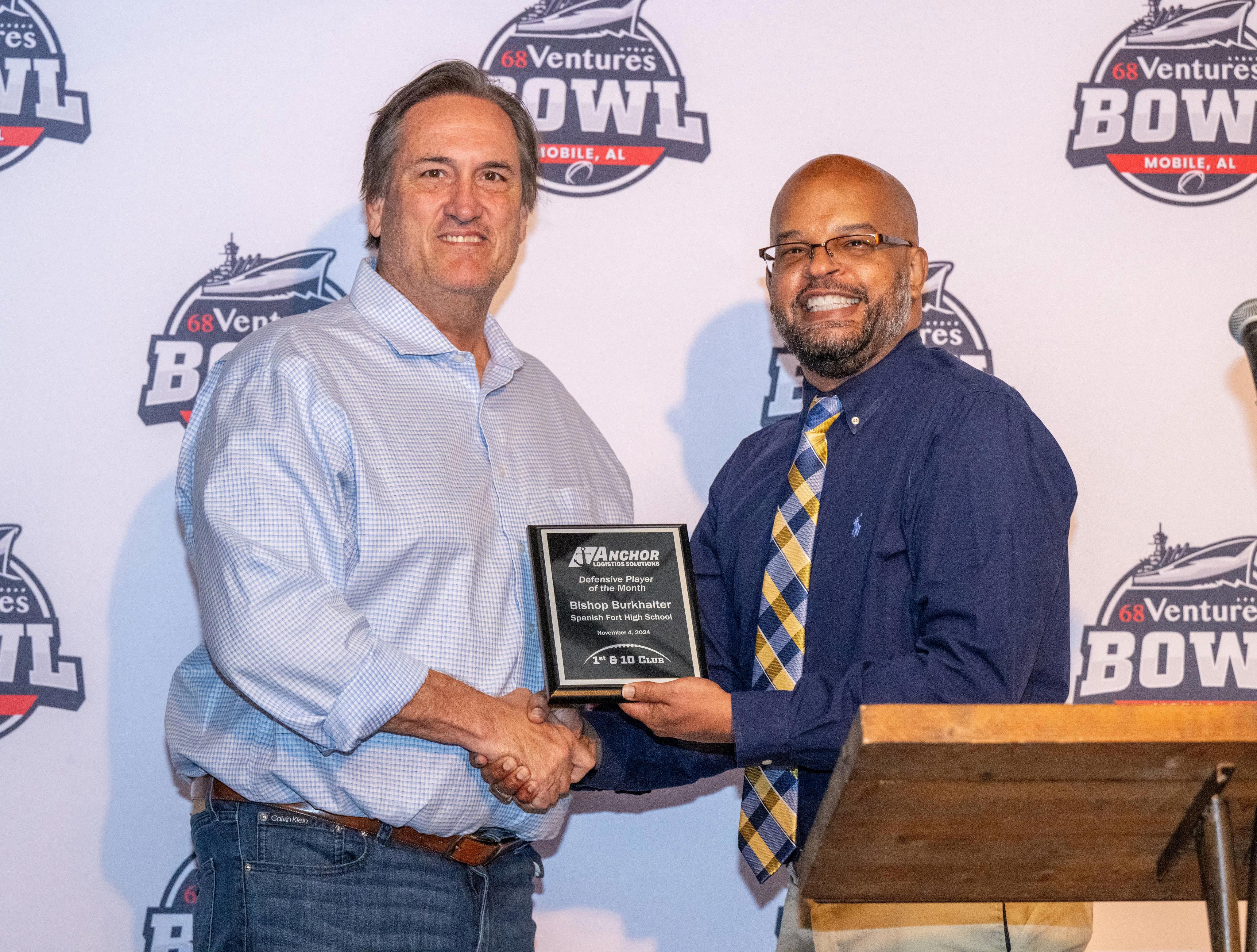 Bishop Burkhalter is a 6’ 185lb Linebacker for the Spanish Fort Toros. This season Bishop has recorded 128 tackles, 51 solo, 77 assists, 1 sack, 11 TFL’s, 5 pass breakups along with 2 recovered fumbles, one of which for a touchdown. Burkhalter also went viral this season for a stunning 1yard punt return touchdown. Burkhalter has helped lead the Toros to an 8-2 record and will face Benjamin Russell High in the first round of the playoffs . Award received by his dad.