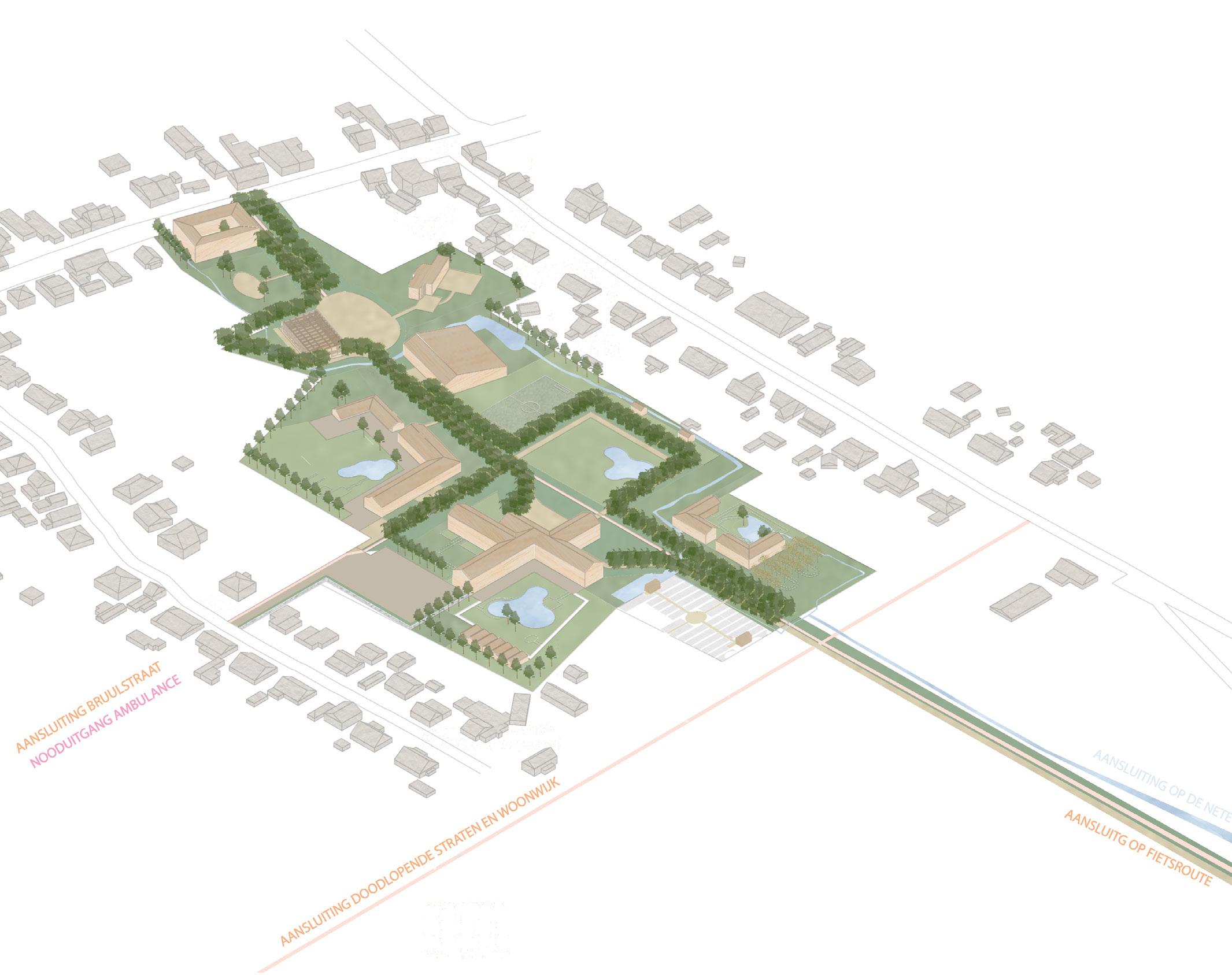 Er werd op verschillende schaalniveaus gezocht naar de benodigde gemeenschapsvoorzieningen om zowel de mentale als fysieke gezondheid van de bewoners te stimuleren. Op macroschaal werd er naar aansluitingen gezocht op het stedelijk weefsel. De dreef sluit aan op de omliggende woonwijken en fietsroutes. Ook de watervoorzieningen worden aangesloten op de nabij gelegen Nete en doen dienst als buffer tegen overtollig regenwater.