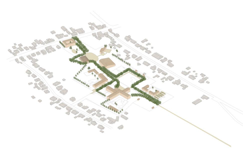 isometrie van de site: inplanting van de ontworpen volumes en aansluiting op het bestaand, stedelijk weefsel