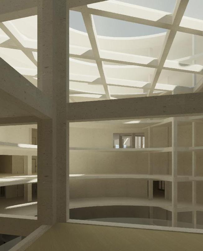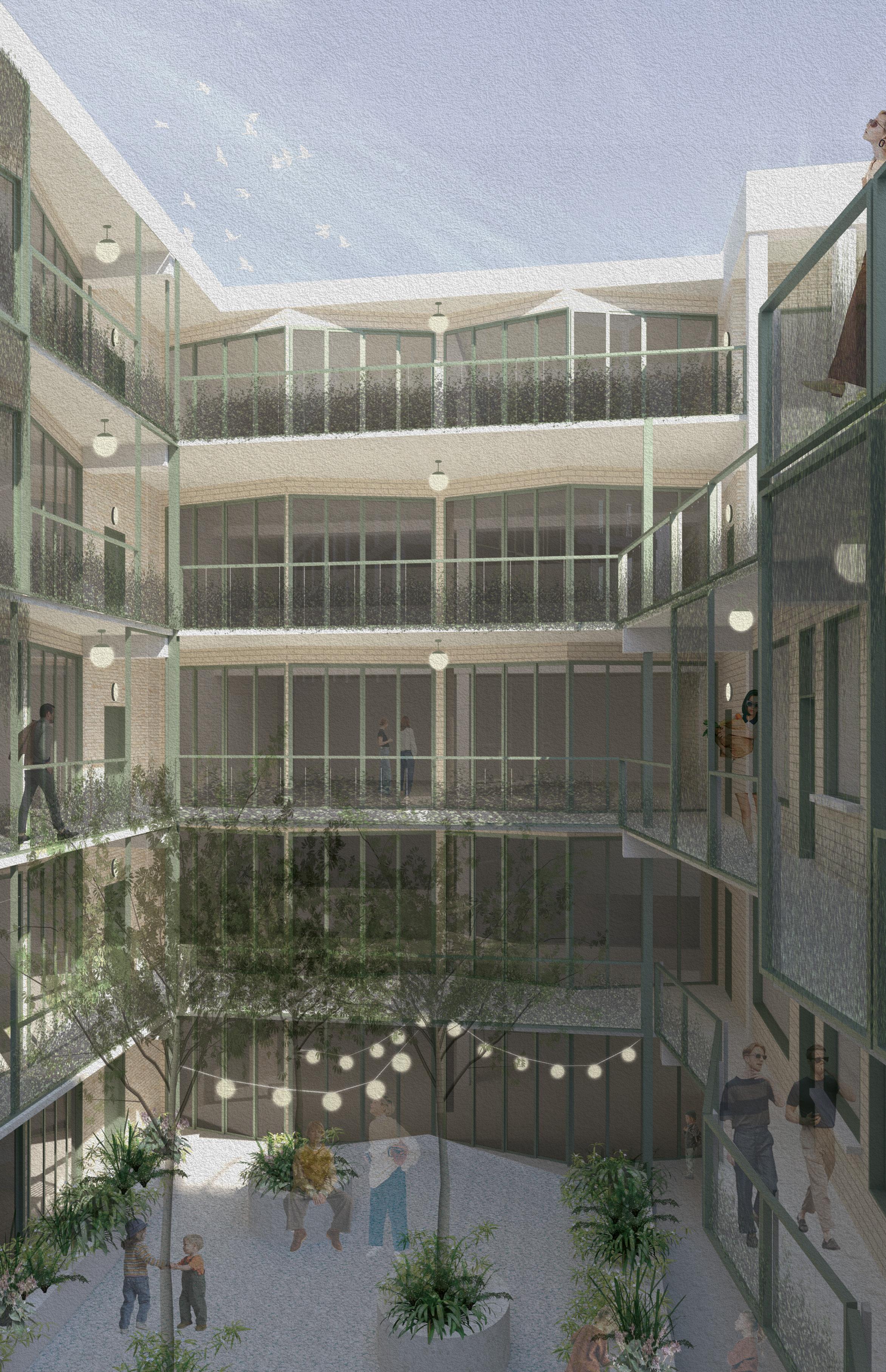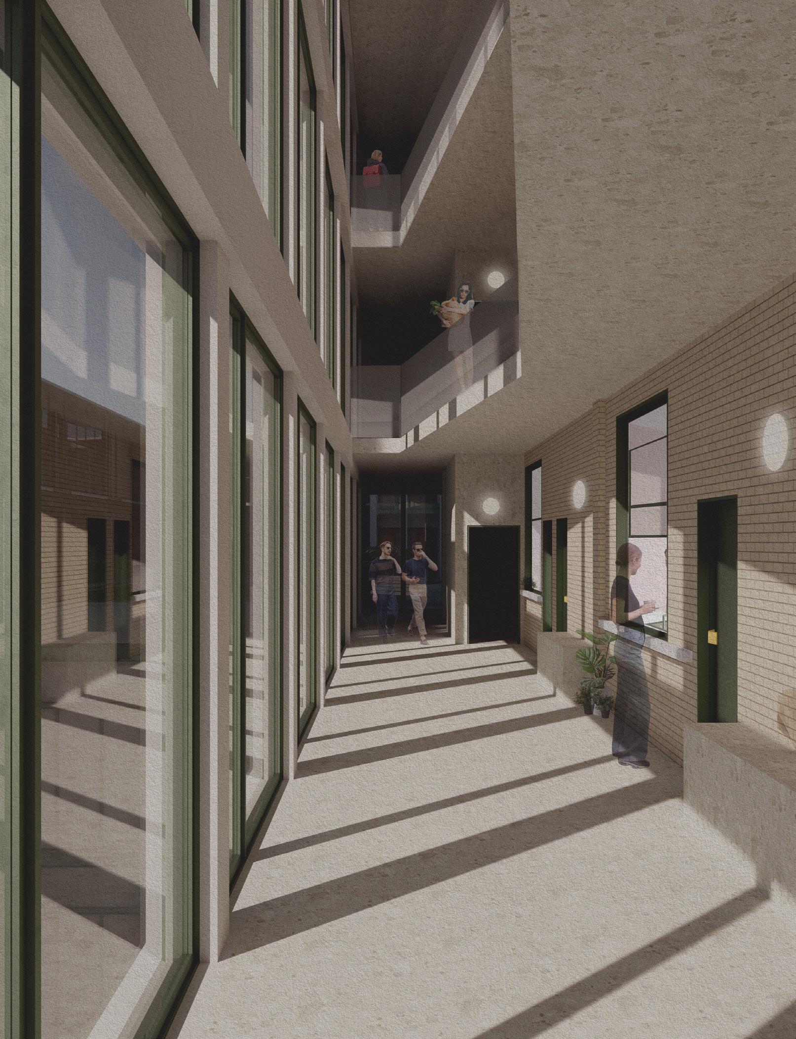 De patio die met het woongedeelte verbonden is, creëert een private ruimte voor de appartementen. Ze kent een collectief karakter met transitiezones tussen publieke, collectieve en private ruimtes. Ook het combineren van woon- en werkfuncties werd bestudeerd. Het finaal ontwerp heeft als doelstelling om een antwoord te formuleren op de vraag: Hoe ziet de ideale werken woonomgeving van de toekomst eruit?