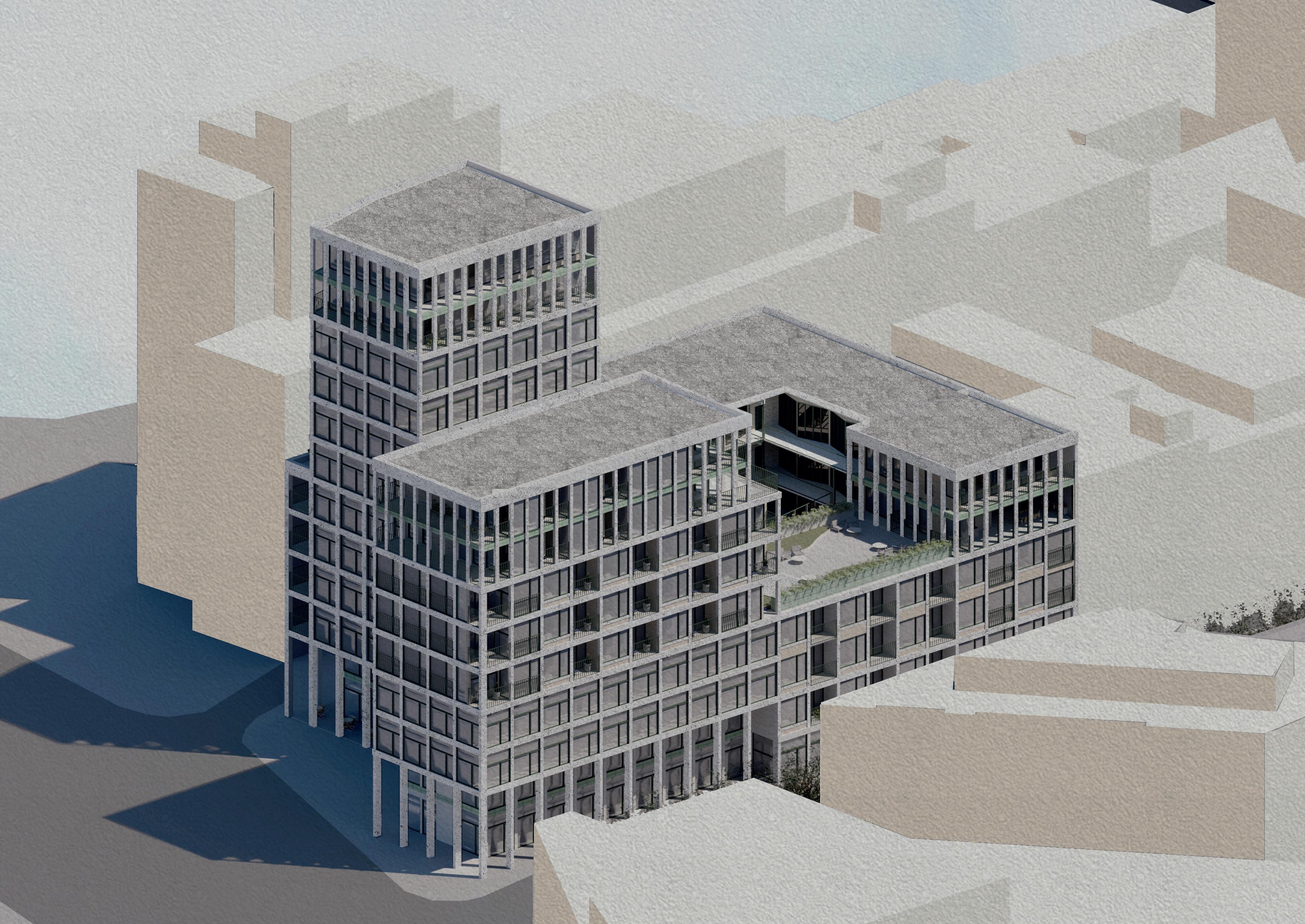 De nood aan kwalitatieve, open ruimte in de stad is een aandachtspunt. De footprint wordt gereduceerd tot een minimale oppervlakte. Het ontpitten van het bouwblok was een eerste stap in het ontwerp. De patio in het centrum zorgt voor licht, lucht en stilte. Ze sluit aan op de commerciële ruimtes in de plint en dient als kijkgroen voor de hoger gelegen woningen.