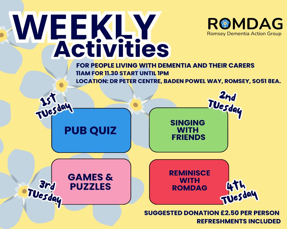 Romsey Dementia Action Group (ROMDAG) is dedicated to supporting people living with dementia and their families in Romsey and the surrounding areas. We believe that a dementia diagnosis doesn’t mean life stops - it simply calls for new ways to connect, create, and enjoy life. Each week, ROMDAG offers a variety of activities designed to stimulate, engage, and uplift; music, singing, pub quiz and memory sessions spark conversation and laughter. These social gatherings provide peersupport and a safe, welcoming space for people to share experiences, make friends, and feel less isolated.