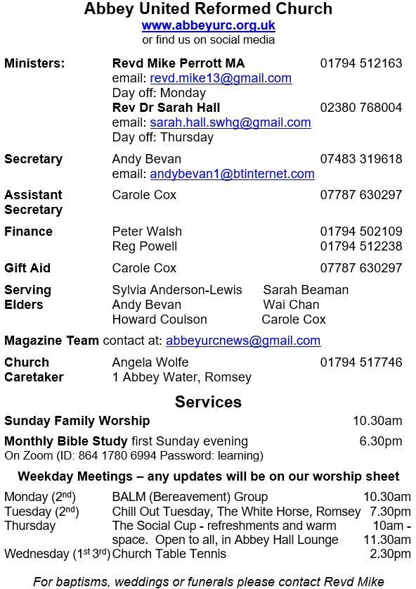 Views expressed in this magazine are not necessarily those of Romsey or Braishfeild URC, nor the elders or production team.