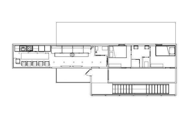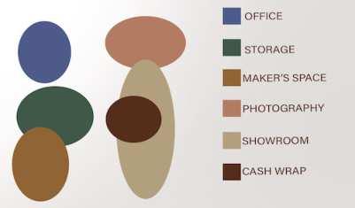 The lowerlevelserves as the hub ofdesignated workspaces, encompassing the cash wrap counter, offices, a photographystudio, and even aweaving room.The upperlevel, accessiblevia a staircase, is exclusively reserved for the residentswho alsowork on the lowerlevel.This design fosters convenient access to work areas while maintaining the crucial distinction betweenworkandhome.