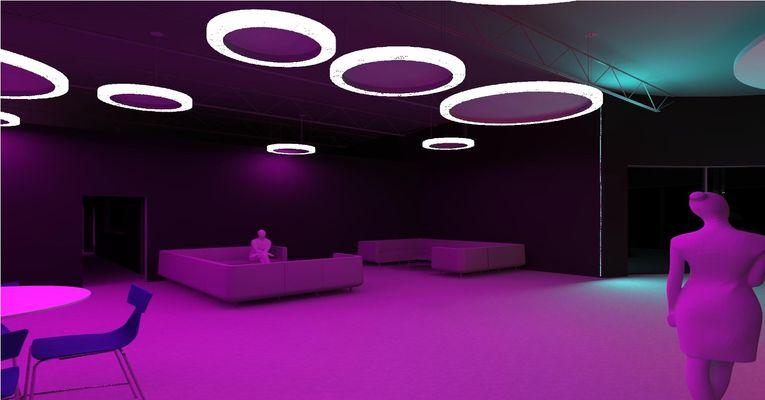 The deliberate repetition of circular elements in this design serves as a powerful focal point, directing all attention toward the stage. A dynamic array of radiant, rounded, and purple lighting fixtures strategically guides one's gaze along the path of the music, intensifying the immersive experience.
