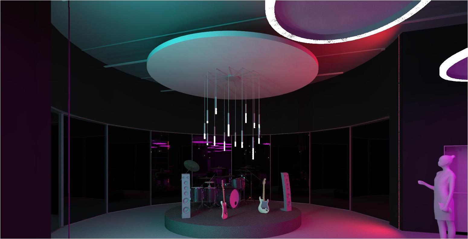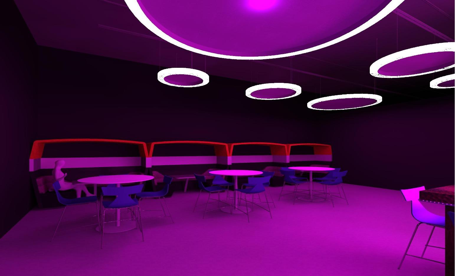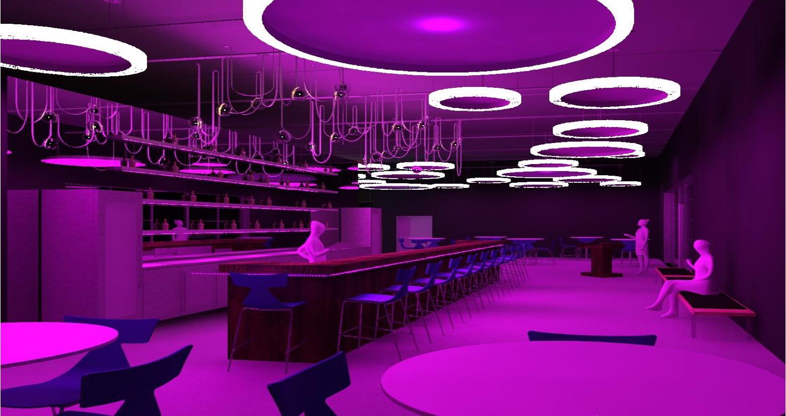 This group project was centered around a song and artist, and we decided to focus on Prince's "Let's Go Crazy." The word "Electric" that opens the song served as our guiding star, influencing the direction and aesthetic we aimed to capture. Prince is synonymous with the color purple and a dramatic rockstar persona, so we sought to embody these iconic elements. In our collaborative effort, we curated a nighttime bar concept, complete with a stage that exuded the quintessential rockstar vibe. Our interpretation of "electric" conjured images of bold, vibrant colors, and it only made sense to integrate these elements into the bar's design. As a result, we incorporated an array of vivid purple lighting variations, creating a visually dynamic and energetic atmosphere.