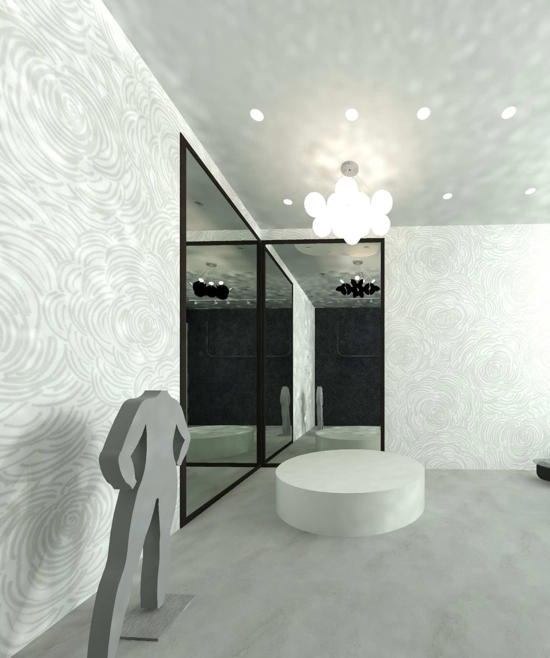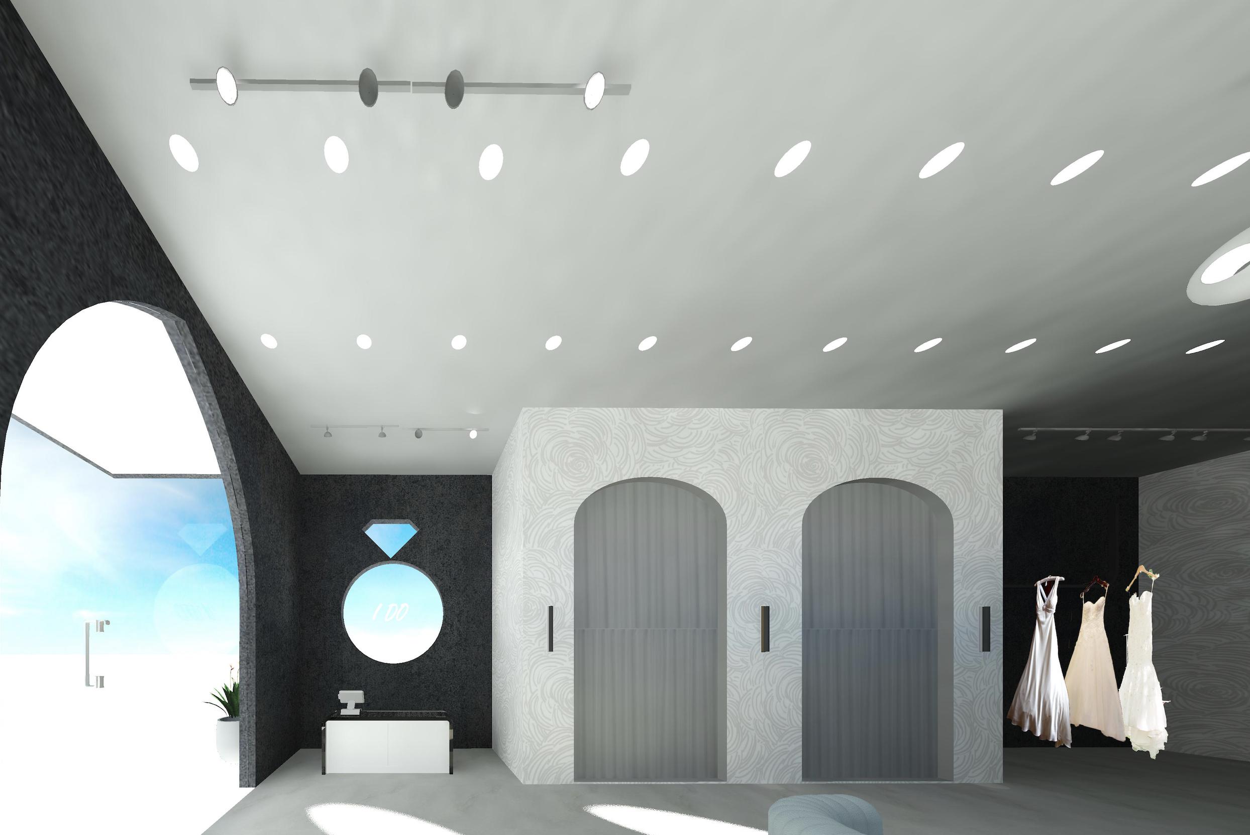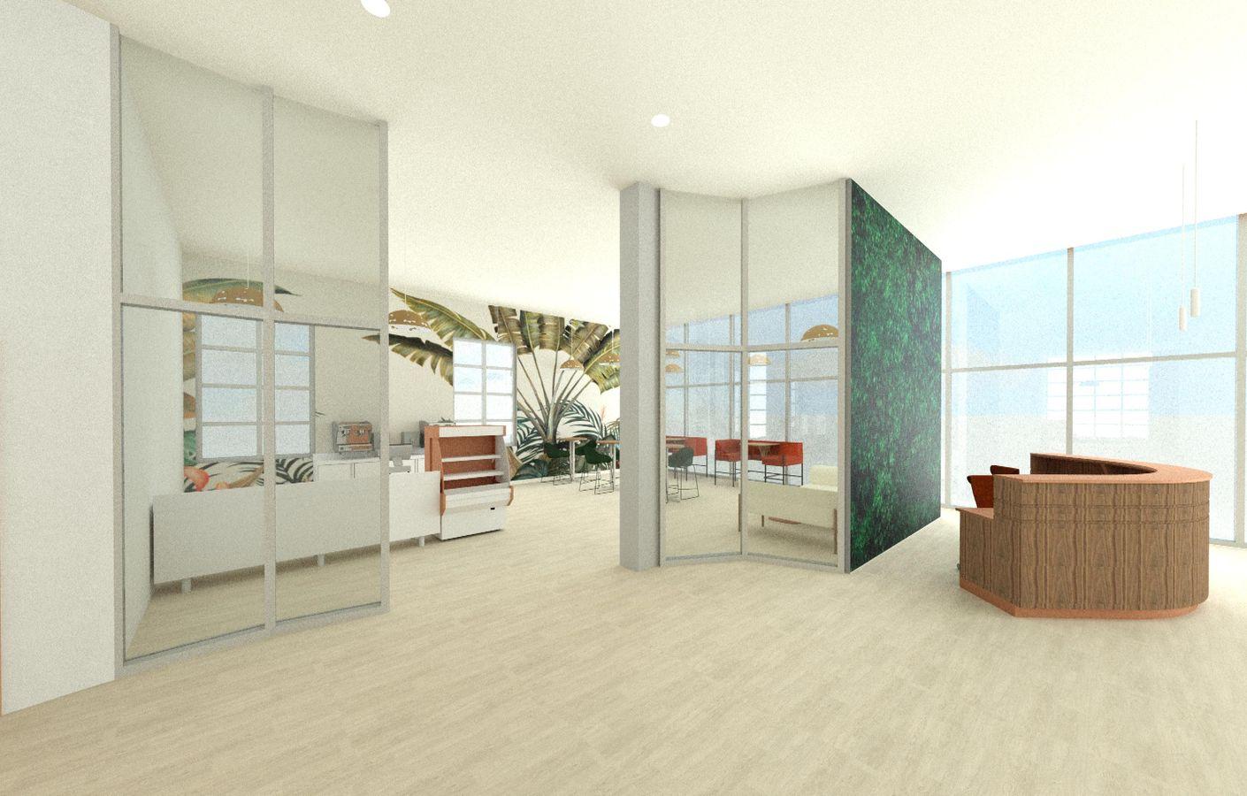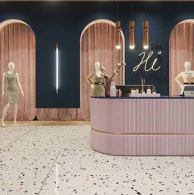 The image featured above captures the retail area and the cash wrap, designed with glass hallways and unobstructed openings to ensure effortless visibility. The primary objective is to grant customers the ability to fully envision the space's potential as they enter and navigate through the compact yet inviting area.