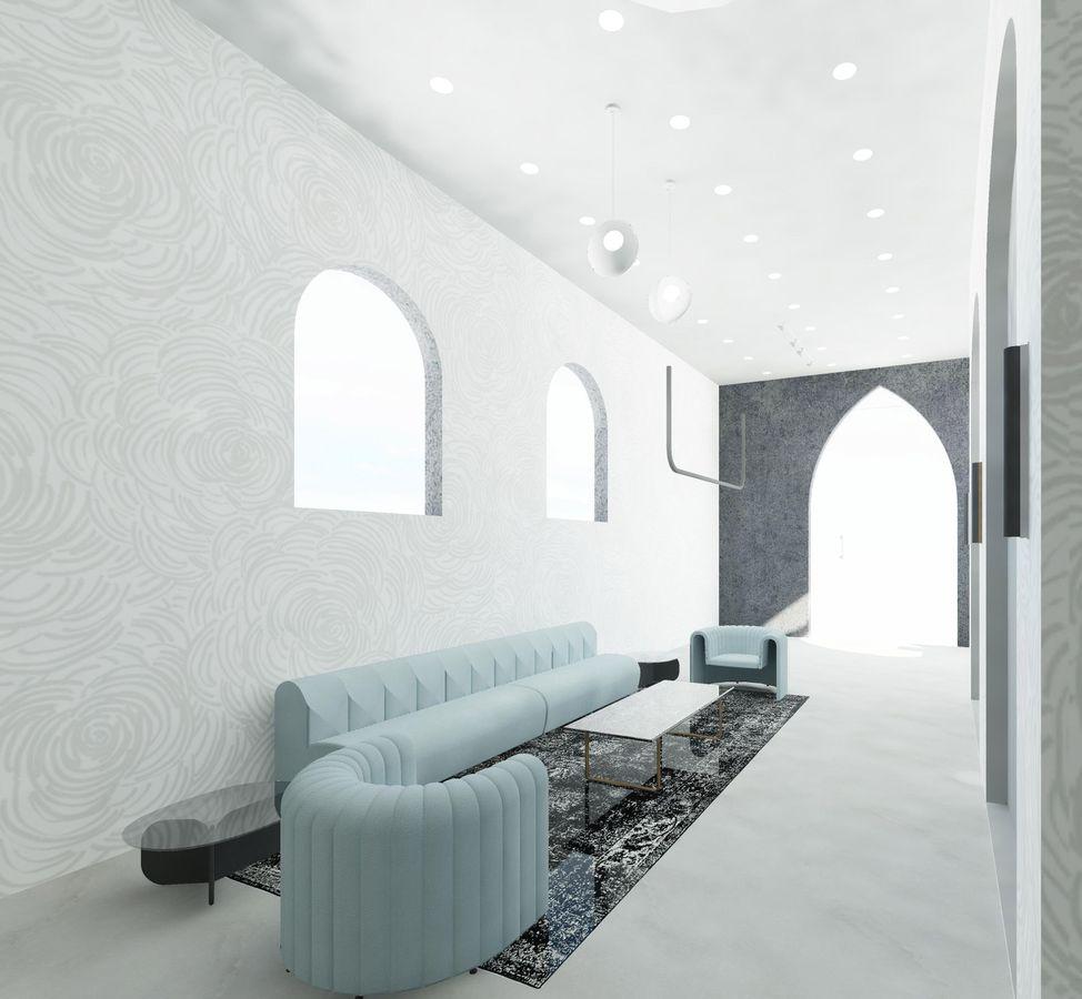 These renderings beautifully highlight the Tiffany-inspired splashes of blue integrated into the furniture. The dark, intricately patterned rug and side table finishes, on the other hand, serve to harmonize the overall atmosphere of the space, striking a perfect balance between light and airy elements while introducing a compelling contrast to this inviting seating area.