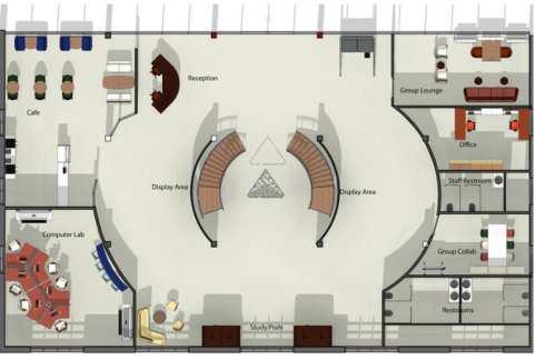 The first floor seamlessly facilitates student traffic, catering to their various library needs. Whether it's for a quick snack at the café, resource inquiries at the reception, or direct access to the computer lab, this floor's design ensures a smooth transition between these spaceswithitsgracefullycurvedwalls.