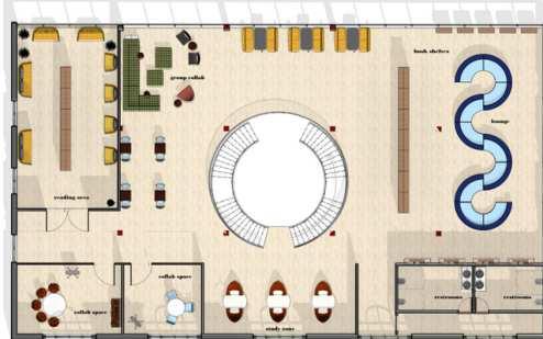 Cafes have long been nurturing grounds for some of the most brilliant ideas and creations. In the context ofourdesign, the inclusion ofthis caféwas not just a choice but a necessity. It caters to the fundamental need of students for a quick caffeine fix and delectable snacks, enabling them to take a break from their studies without the hassle of leaving the library.