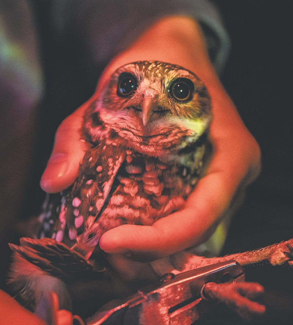 A Florida burrowing owl is banded for tracking and identification purposes at MacDill Air Force Base April 8.