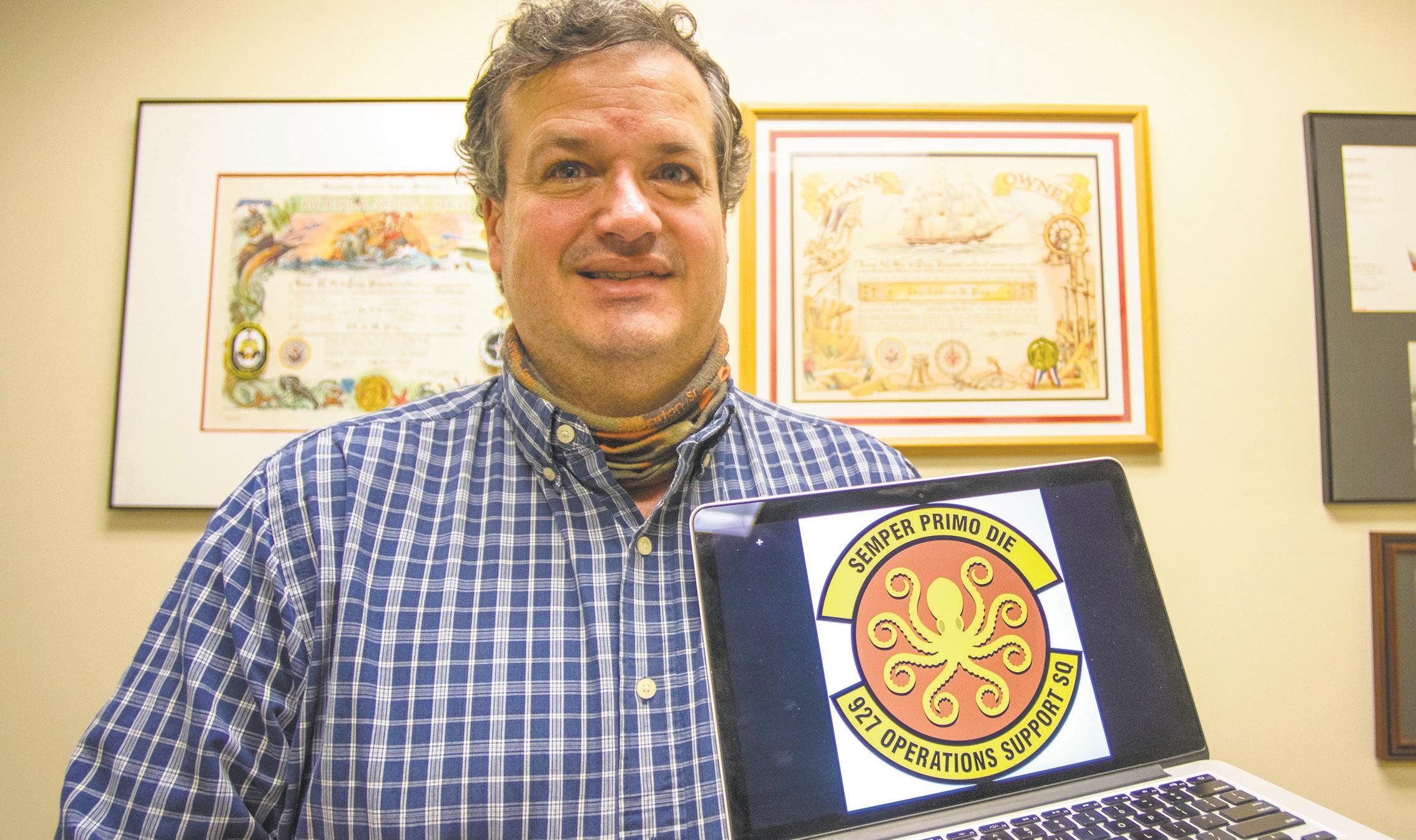 927th Air Refueling Wing Historian, Andrew Pray, displays the final approved design for the 927th Operations Support Squadron Occupational Camouflage Pattern uniform patch on MacDill Air Force Base Jan. 9. The emblem was approved by the U.S. Air Force Historical Research Agency on Dec. 21.