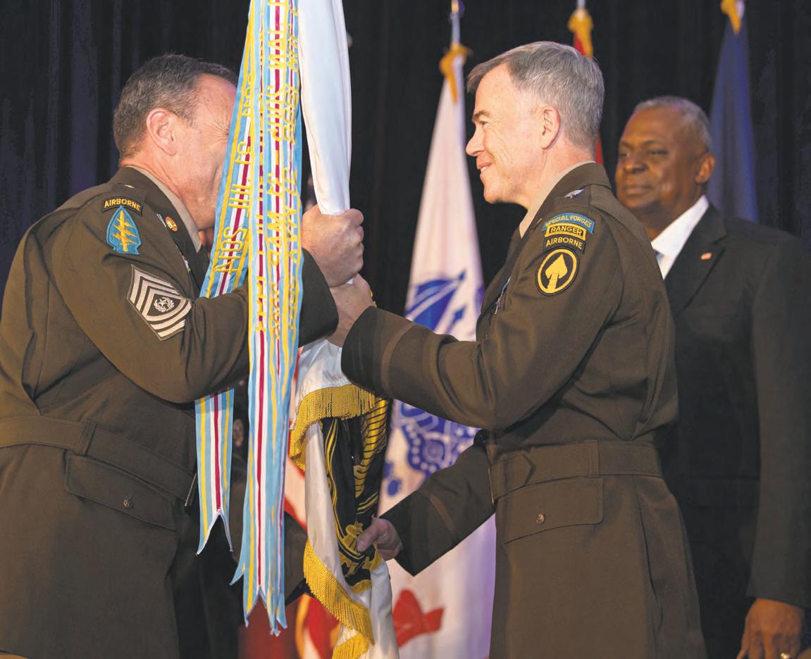U.S.ArmyGen.Bryan P. Fenton,right,U.S.SpecialOperationsCommandcommander,passesthecommandcolorsto CommandSgt.Maj.ShaneShorter,left,USSOCOMseniorenlistedleader,after receivingthecolorsfromSecretaryof DefenseLloydJ.AustinIIIduringachangeofcommandceremonyforUSSOCOMat Tampa,Fla.,Aug. 30,2022.Army Gen. Richard D.Clarke relinquishedcommandtoGen.Fenton,whopreviouslyservedasthe CommanderofJoint SpecialOperationsCommand,Fort Bragg, N.C. Gen. Fentontakes helmofUSSOCOM -page8