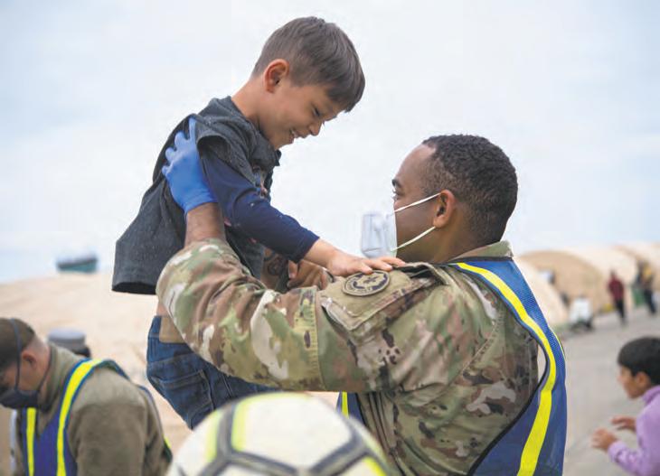 PhotobyAirman1stClassAlexciaGivens U.S.ArmyPfc.JaredStevens,2ndCavalryRegimentinfantryman,plays withchildrenduringOperationAlliesRefugeatRamsteinAirBase,Germany, Sept.13,2021.OARhasbeenthelargesthumanitarianevacuation airlifttodateinU.S.history.