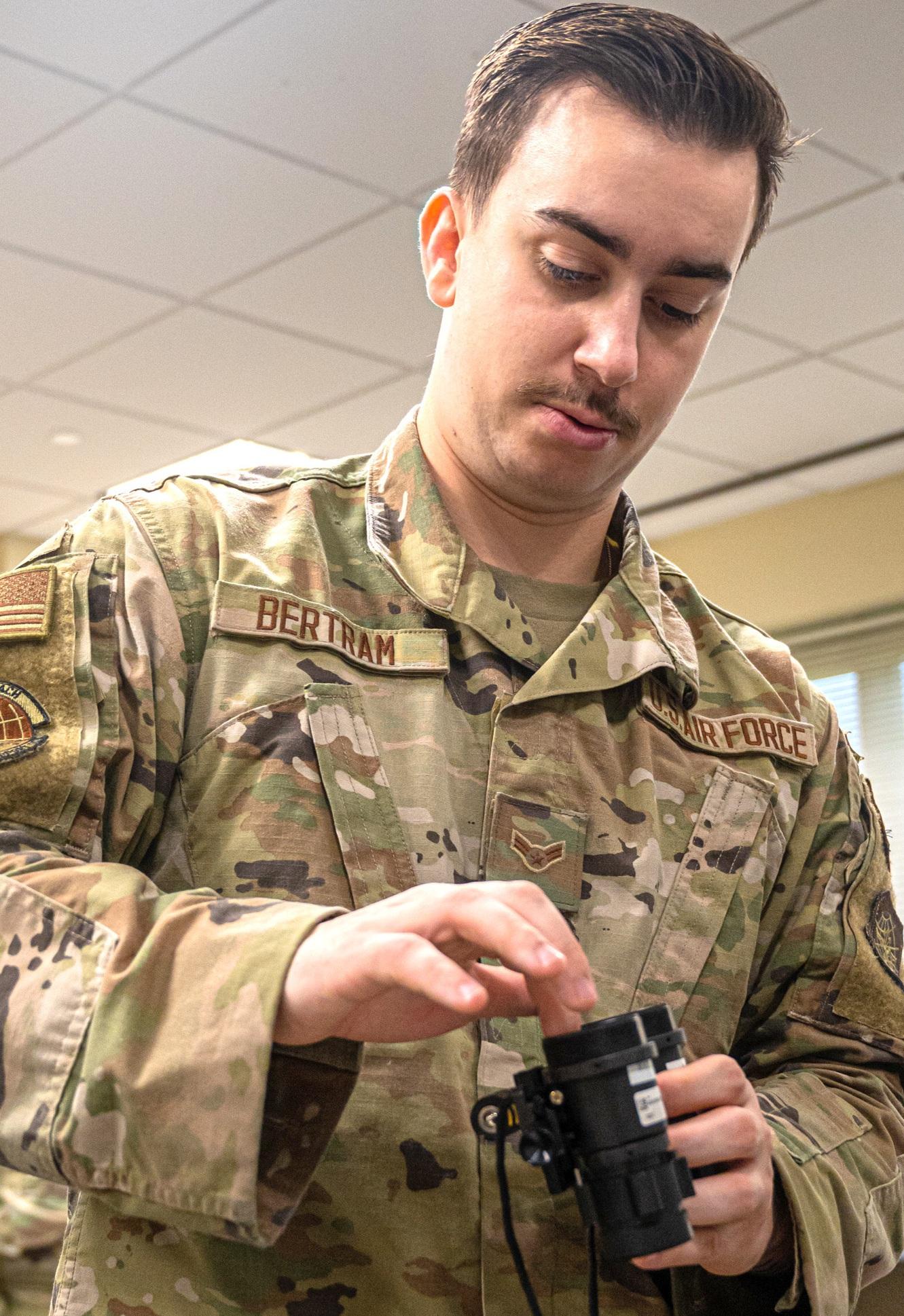 U.S. Air Force Airman 1st Class Will Bertram, 305th Operations Support Squadron aircrew flight equipment technician, converts legacy green night vision goggles to white phosphor NVGs for the KC-46A Pegasus at Joint Base McGuire-Dix-Lakehurst, N.J., Aug. 25. This upgrade provides a significant advantage for KC-46A aircrews during critical nighttime missions, proving our commitment to technology, which fuels our ability to achieve mission success and improve mission capability. Be