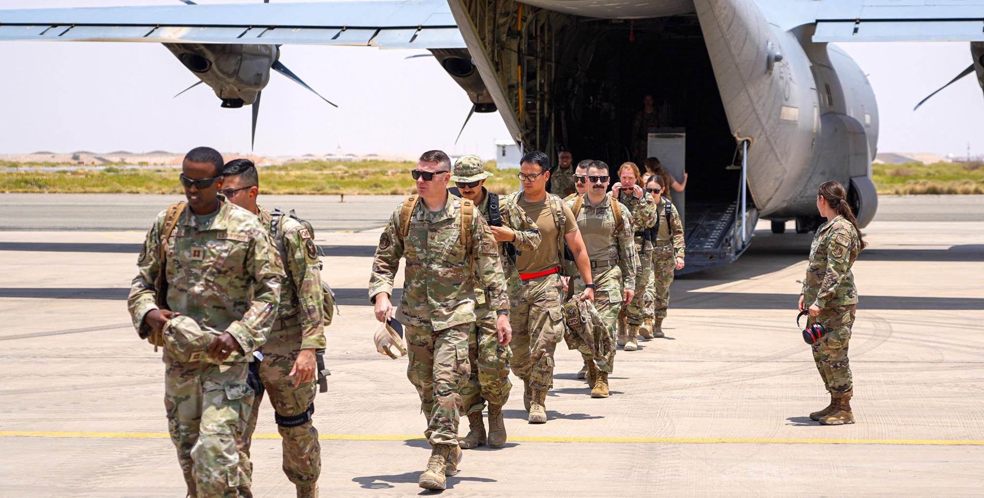 U.S. Airmen from the 378th Air Expeditionary Wing arrive for Operation Agile Spartan 23.2 at an undisclosed location, Aug. 20,. Agile Spartan 23.2 is a multinational operation aimed at demonstrating interoperability, improving response capabilities and furthering security cooperation initiatives throughout the U.S. Central Command area of responsibility.