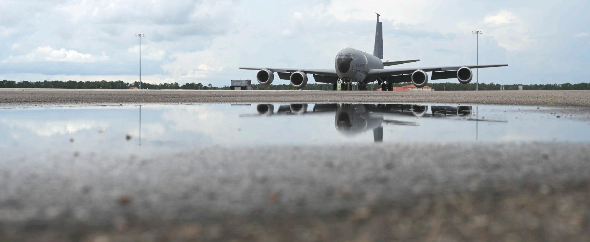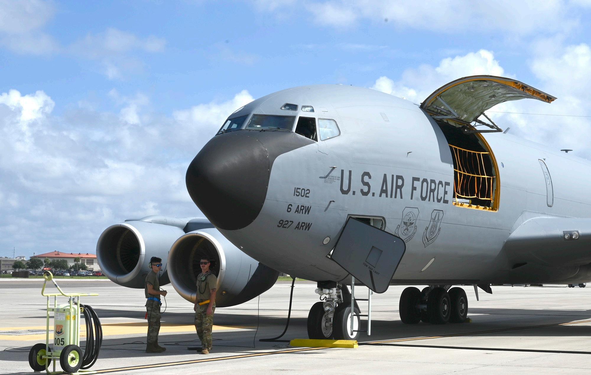 A KC-135 Stratotanker aircraft assigned to the 6th Air Refueling Wing is idle on the flight line on MacDill Air Force Base Aug. 28. All tanker aircraft at MacDill were evacuated in response to the anticipated effects of Hurricane Idalia.