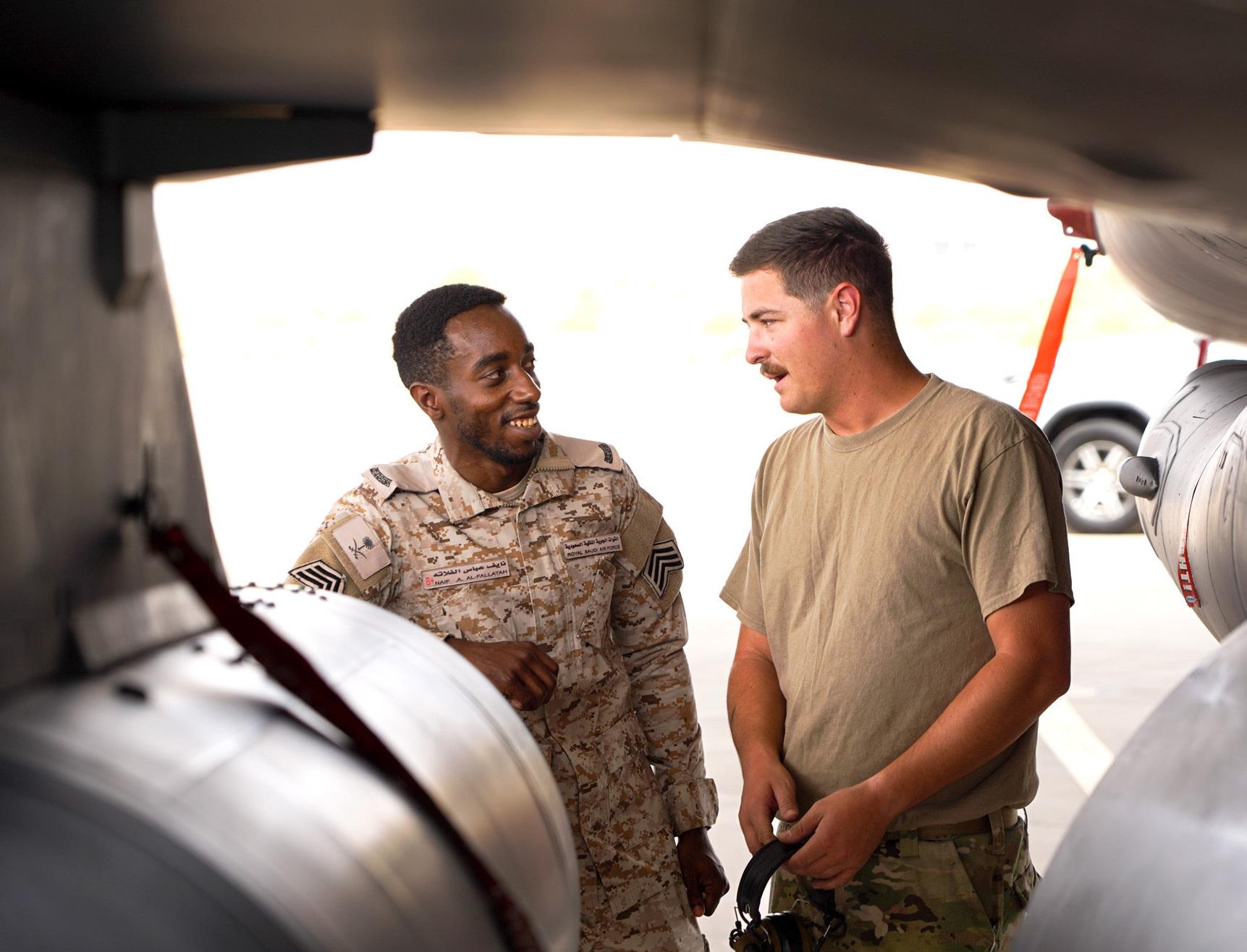 U.S. Air Force Staff Sgt. Jonathan Miles, 125th Expeditionary Fighter Generation Squadron crew chief, speaks with a maintainer from the Royal Saudi Air Force during Operation Agile Spartan, Saudi Arabia, Aug. 21, 2023. Agile Spartan 23.2 is a multinational operation aimed at strengthening interoperability, improving response capabilities, and furthering security cooperation initiatives throughout the U.S. Central Command area of responsibility.