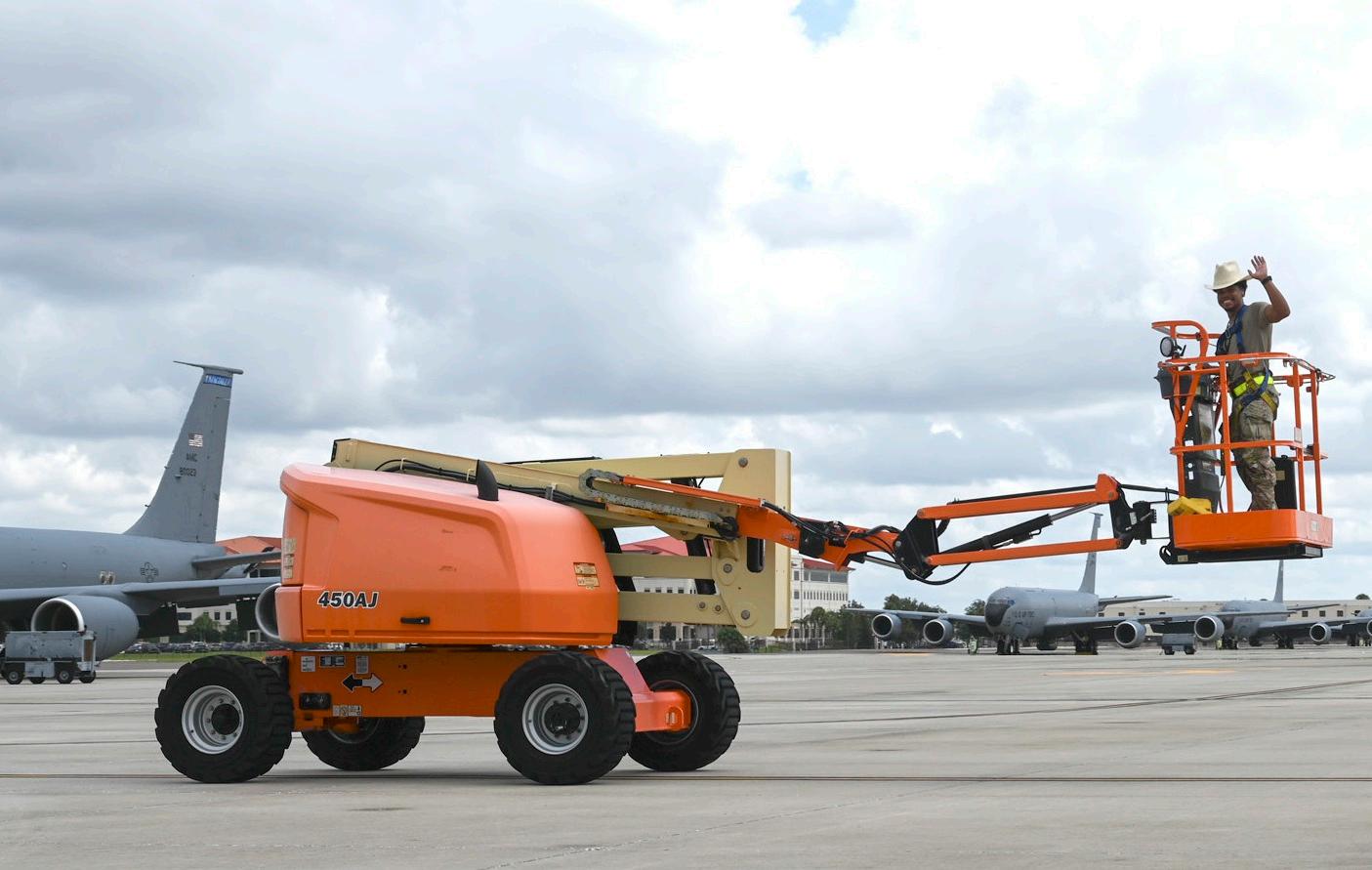 U.S. Air Force Senior Airman Isaac Rivera-Molina , an isochronal inspections craftsman assigned to the 6th Aircraft Maintenance Squadron, transports a lift to a safe location at MacDill Air Force Base Aug. 28. Machinery on base was moved to safe locations in preparation for Tropical Storm Idalia.