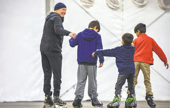 AirForceBrig.Gen.DanielGabrielli, TaskForceHollomancommander, skateswithAfghanevacueesduringaneventatAmanOmid Villageon HollomanAirForceBase,N.M.,Jan.9.TheDefenseDepartmentthrough NorthernCommand,andinsupportoftheDepartmentofHomelandSecurity,isprovidingtransportation,temporaryhousing,medicalscreeningandgeneralsupportforatleast50,000Afghanevacuees.