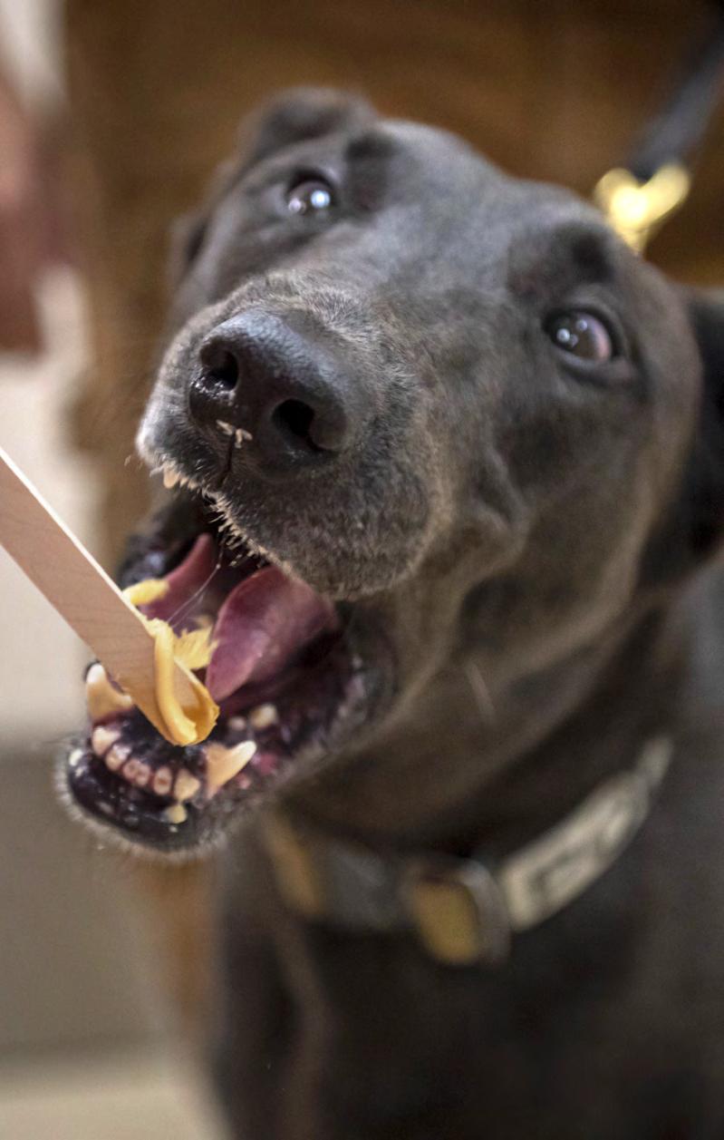 MilitaryworkingdogHannesis rewardedwithpeanutbutterfollowingawellnessexamatMacDillAirForceBaseSept.5.Uponhis returnfromdeployment,MWDHanneswasassessedbyveterinaryclinicstaffandmilitaryworkingdoghandlerswhocheckedhisoverallhealth,includingblood,weight, ears,eyesandteeth.