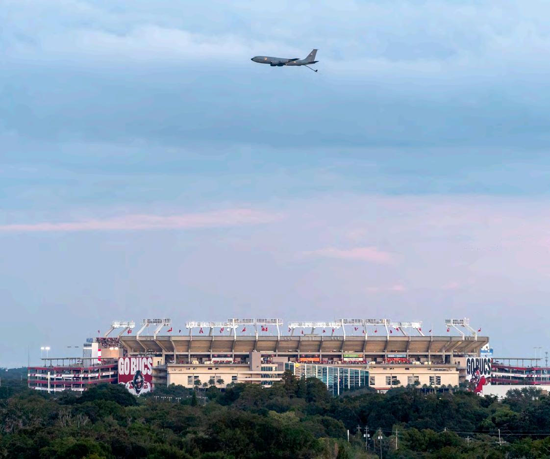 AKC-135Stratotankerassignedto the63rd AirRefuelingSquadron completesaflyoveratRaymondJamesStadium, Tampa,Sept.25.The flyovertookplaceduringtheNationalAnthemandwasaccompaniedby a recognitionduringthegame.The63rdARSisassignedtothe927th AirRefuelingWing.