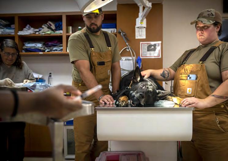Everymission,trainingexerciseandpatrolisajointeffort.Thesepairs trainrigorously-buildingtrustandunderstandingeverydaytokeep eachothersafe. Withthis, handlersmustbeattunedtothedog’ssignals, reactionsandneedstoprovideimmediatecareonstationorinthefield.