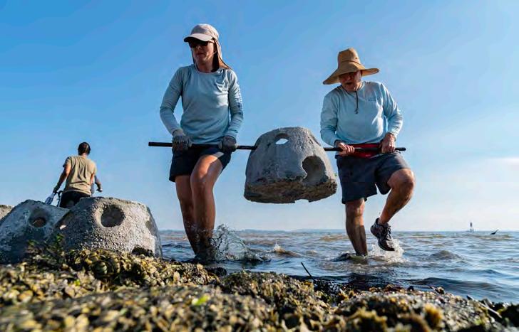 Volunteers install oyster reefballsalongtheshorelineatMacDillAir Force BaseOct.28.Reefballs areusedto stabilizeshorelinesandpreventerosionwhilecreatinghabitatsimilartonaturaloyster communities.