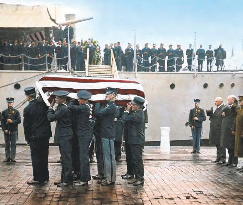 (Above)Bodybearerscarrytheunknown soldierfromtheUSSOlympiatoahorsedrawncaissontotransportthebodytothe U.S.Capitol,Nov.9.Amongthesaluting officersisGen.JohnPershing,whocommandedtheAmericanExpeditionaryForces.