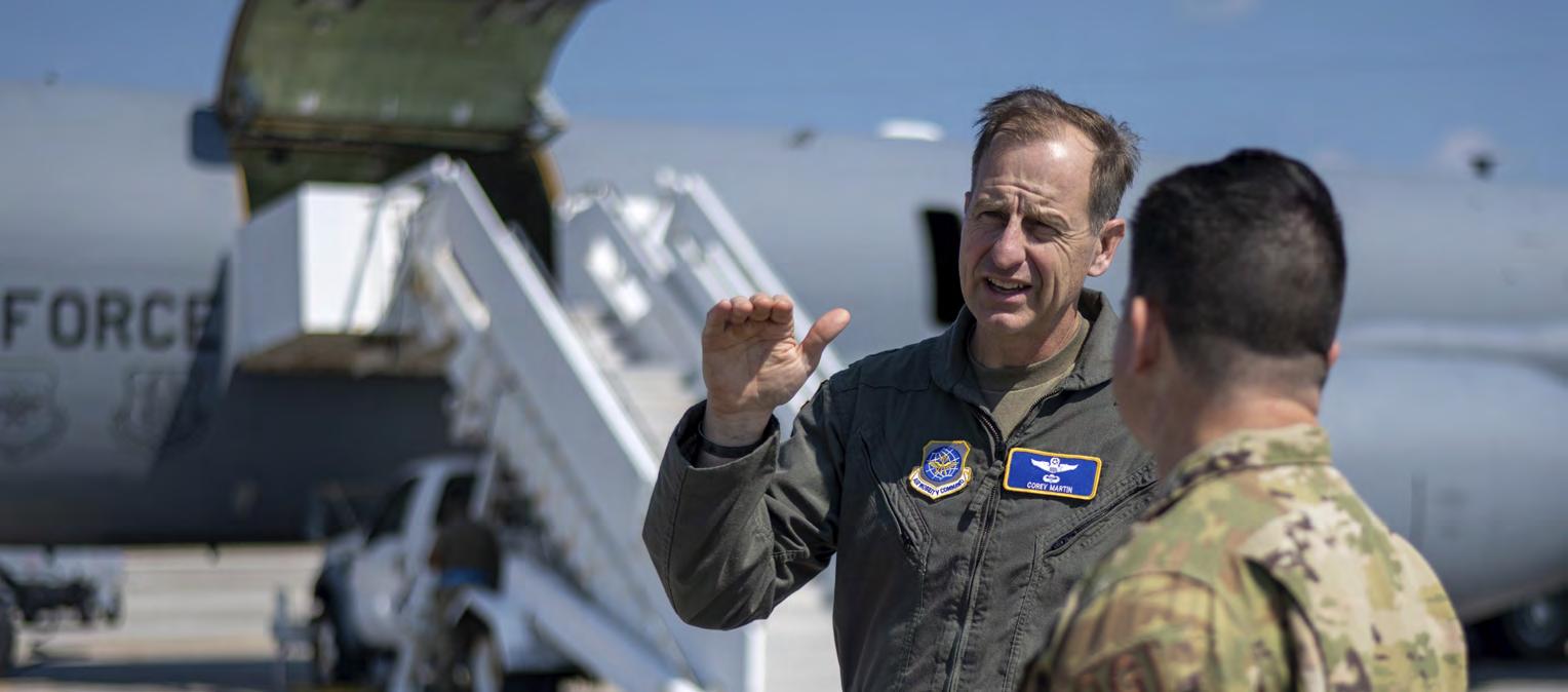 Maj.Gen.CoreyMartin,18thAirForcecommander,speakswithCol.JohnathanBurdick,6thOperationsGroupcommander,infrontofaKC-135 StratotankeraircraftatMacDillAirForceBase,Florida,Feb.23,2023.ThevisitincludedadiscussionontheRealTimeintheCockpitautonavigation system that providedcrucialinsightstothe18thAFcommand team on the day todayflight operationsfor6thAirRefuelingWingpilots.